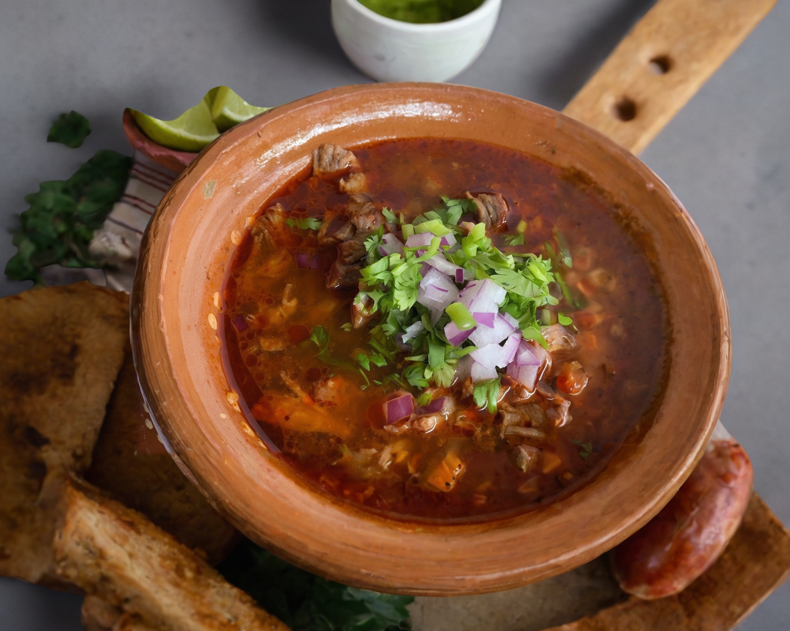 Sope de masa, con frijoles puercos, queso asadero, carne, salsas, verdura y consomé