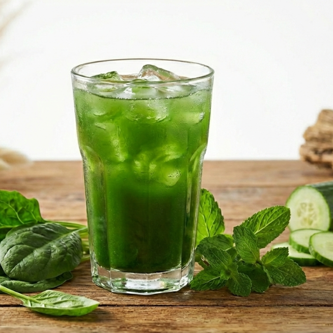 Agua de clorofila con aceites esenciales de hierbabuena, menta y limón 100% natural, ayuda a la digestión y desintoxicación del organismo.