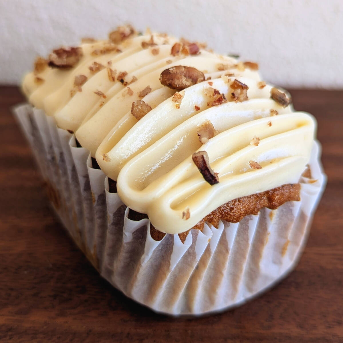 Delicioso, suavecito y esponjoso pastelito de zanahoria decorado con betún de queso y nueces (100g aprox).