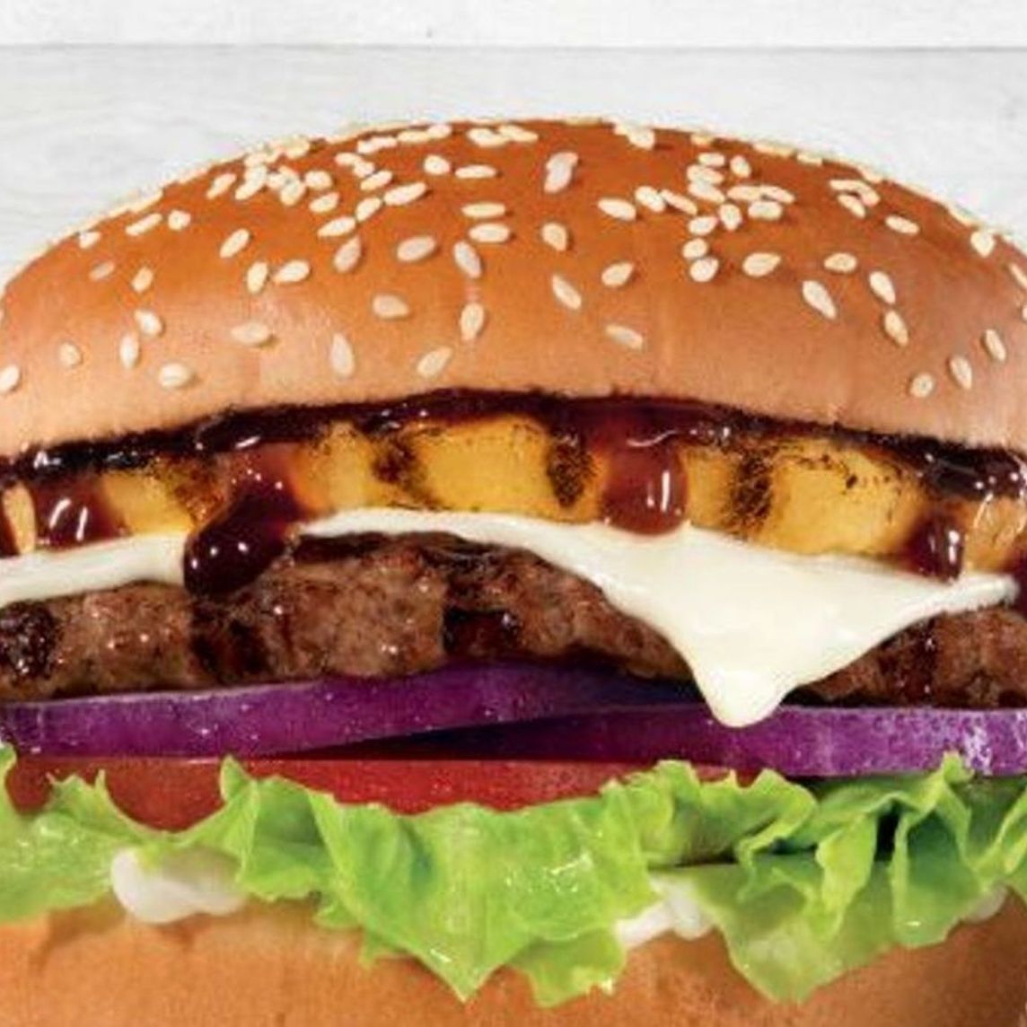 Con carne 100% de res, queso Suizo, piña asada, lechuga, tomate, cebolla morada, mayonesa y salsa Teriyaki. Servida en pan con ajonjolí