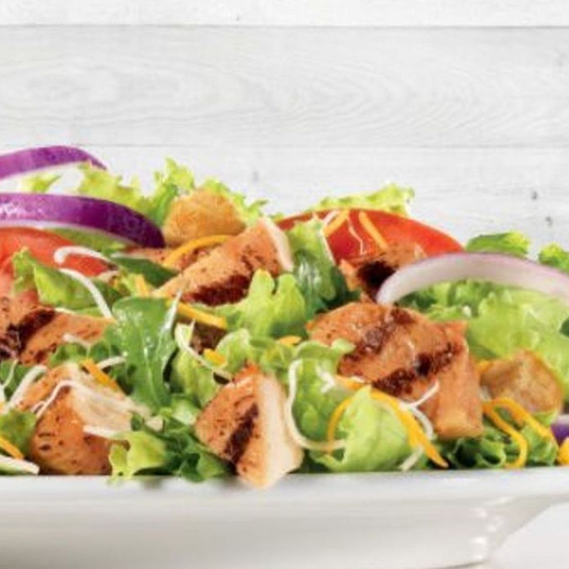 Con pechuga de pollo asada a la parrilla, tomate, cebolla morada, mezcla de queso rallado y crotones en cama de lechuga.