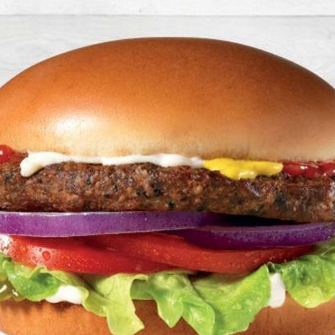 Hamburgesa vegetariana preparada con Quinoa, lechuga, tomate, cebolla morada, mostaza, mayonesa y salsa Cátsup.