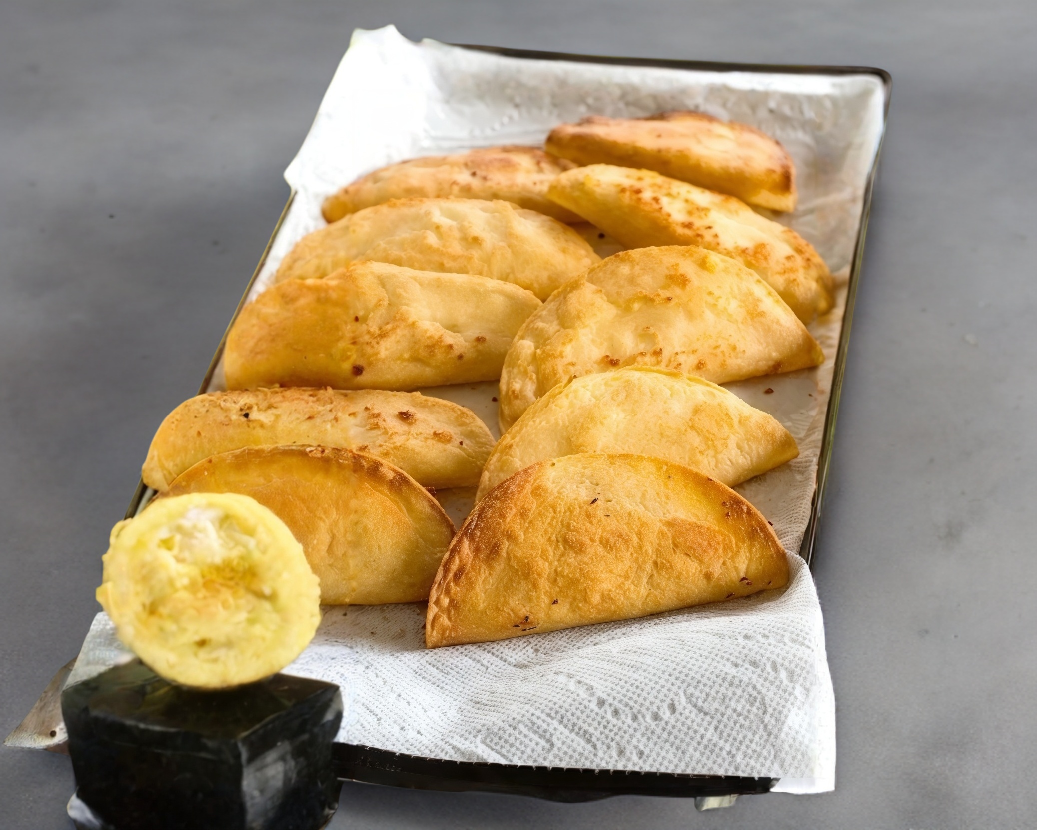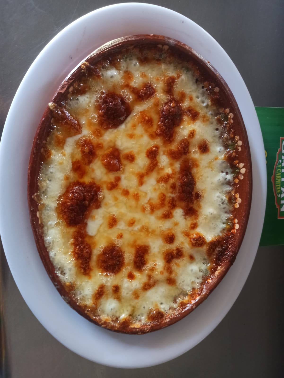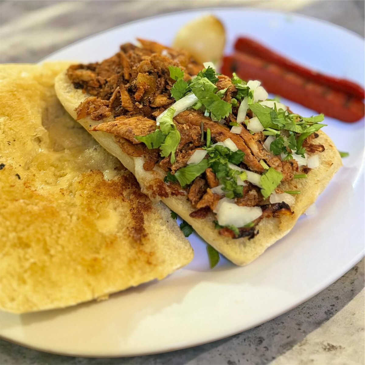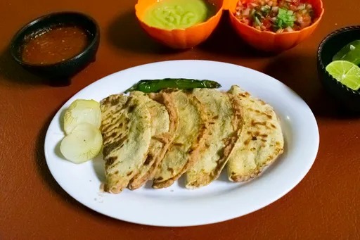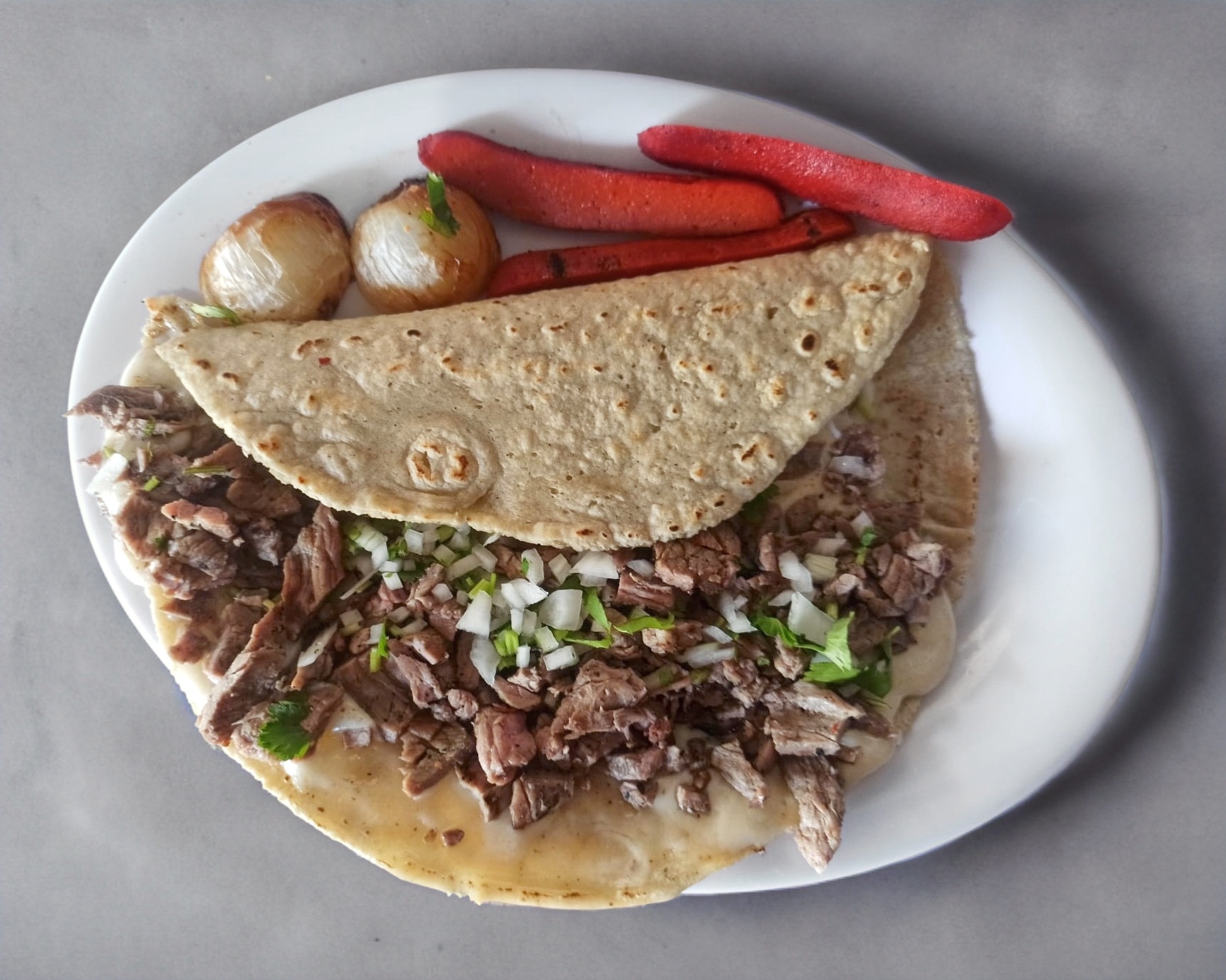 Quesadilla con tortilla de harina, adobada, frijol olla, cilantro y cebolla.