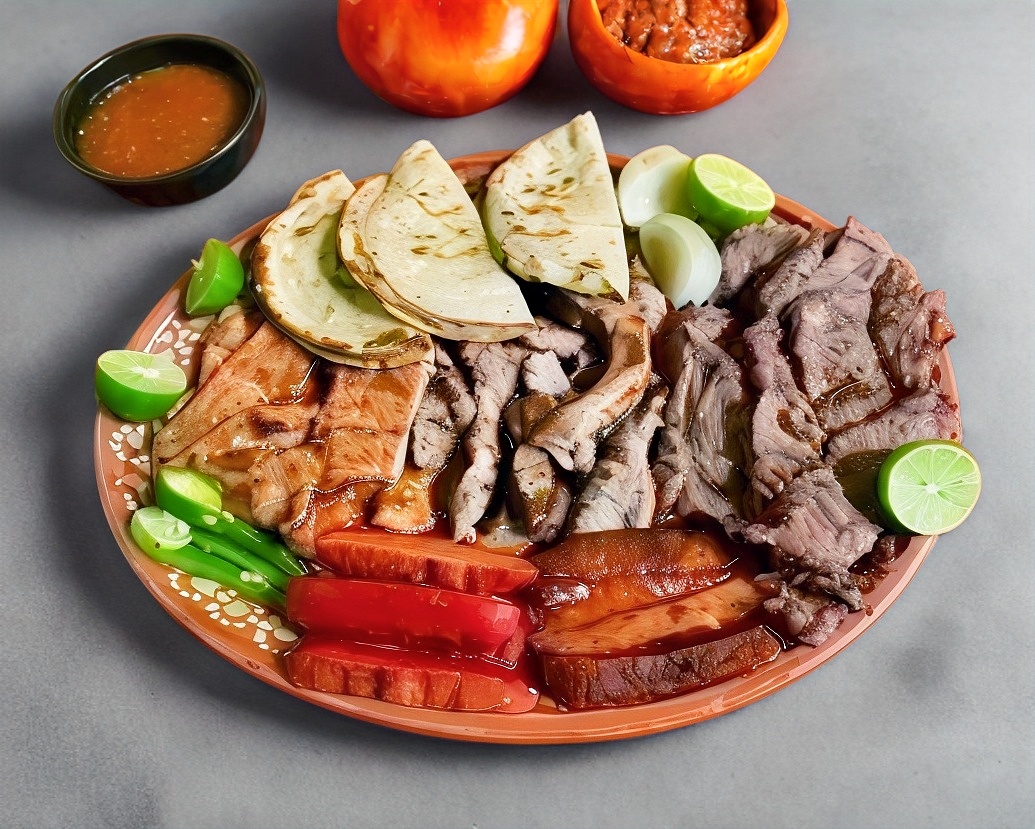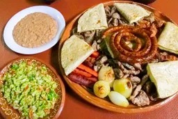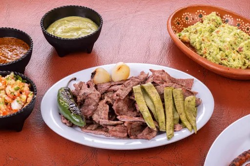 1 Kilo de arrachera, adobada, cerdo, salchicha y chorizo,chistorra, 3 quesadillas, guacamole, nopales asados, frijoles, cebollitas, tortillas y salsas