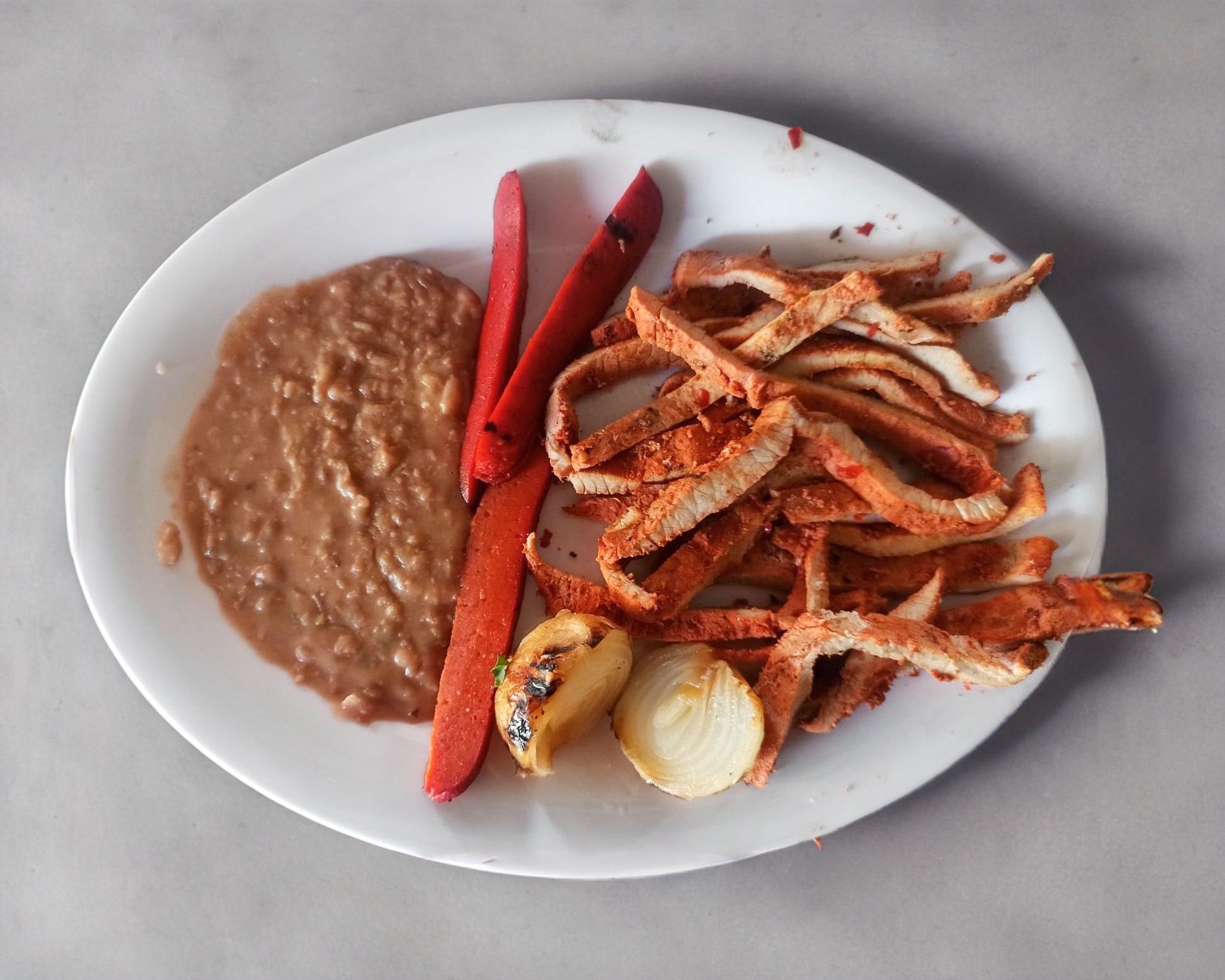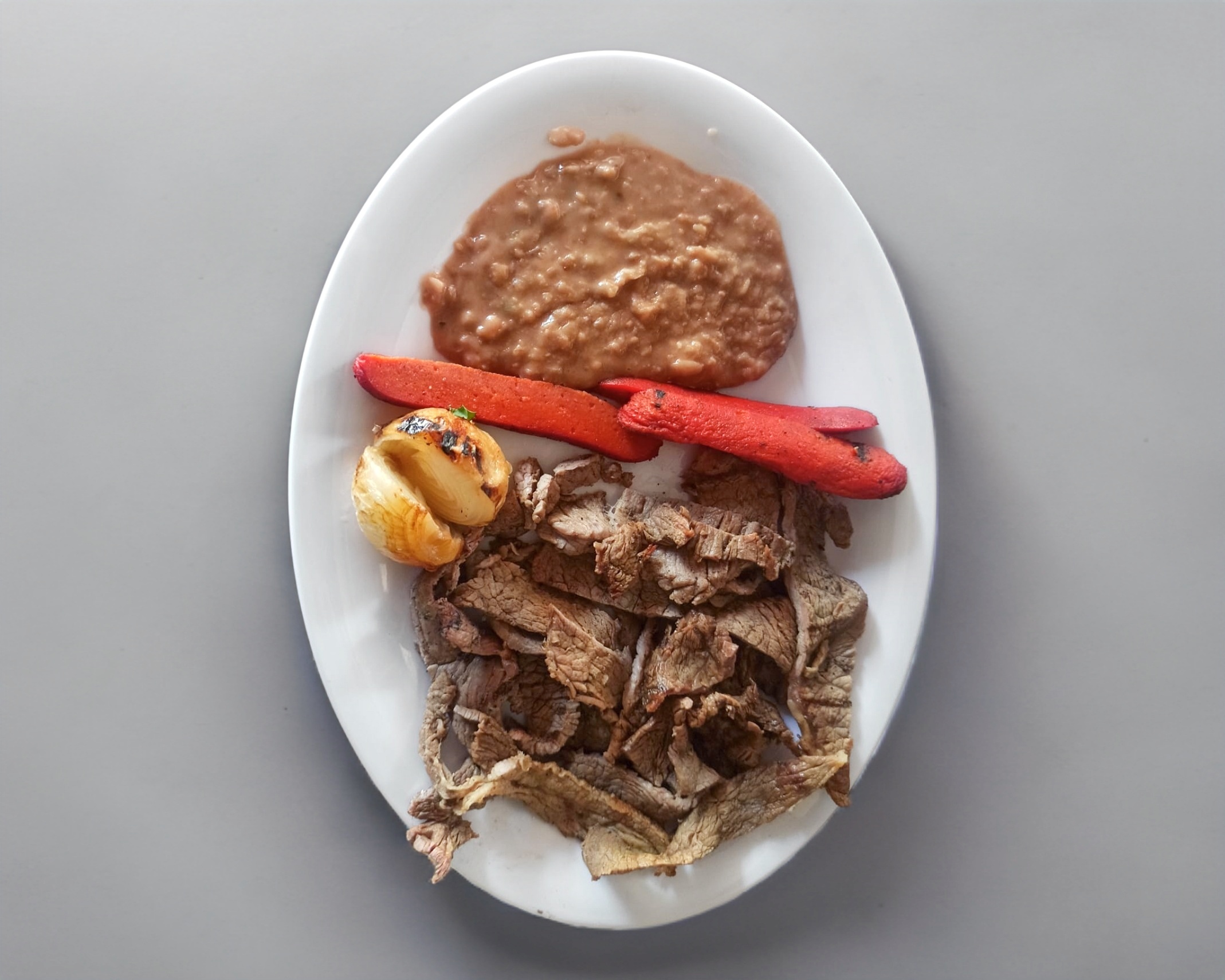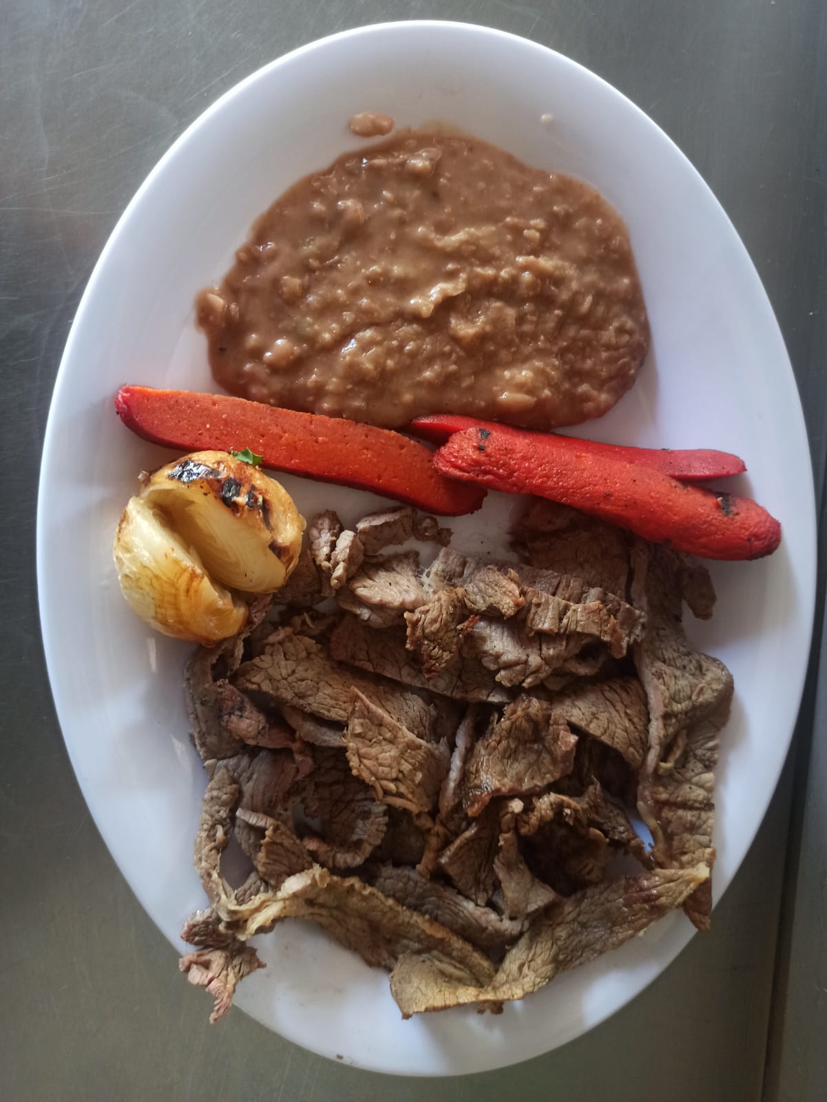 1/4 de kilo de carne, 7 tortillas, frijoles, 1/2 salchicha, 1 cebollita