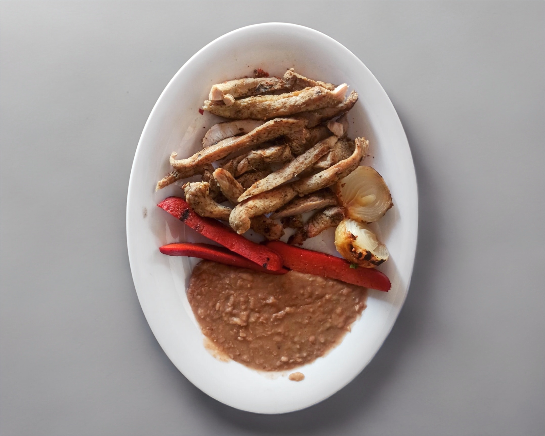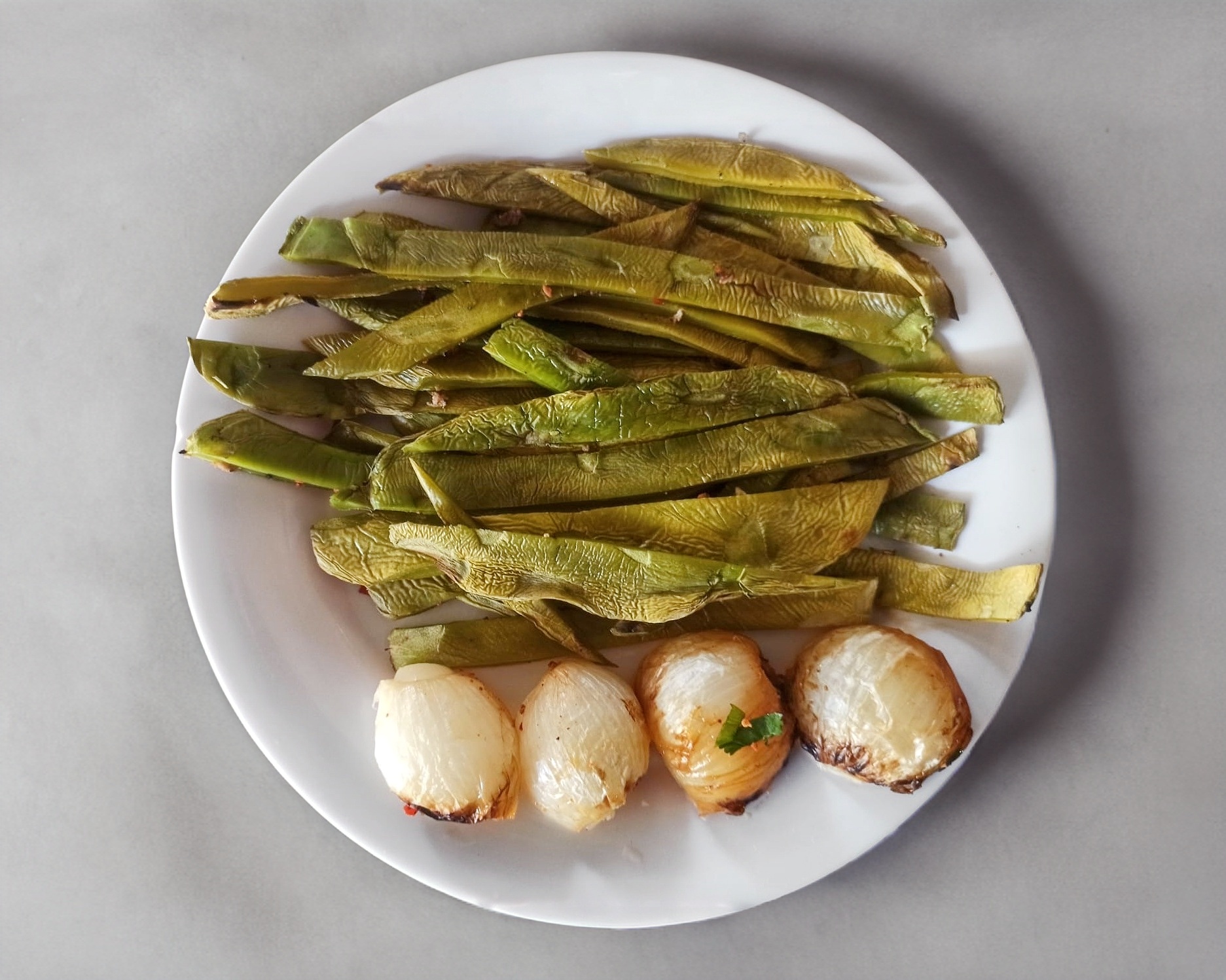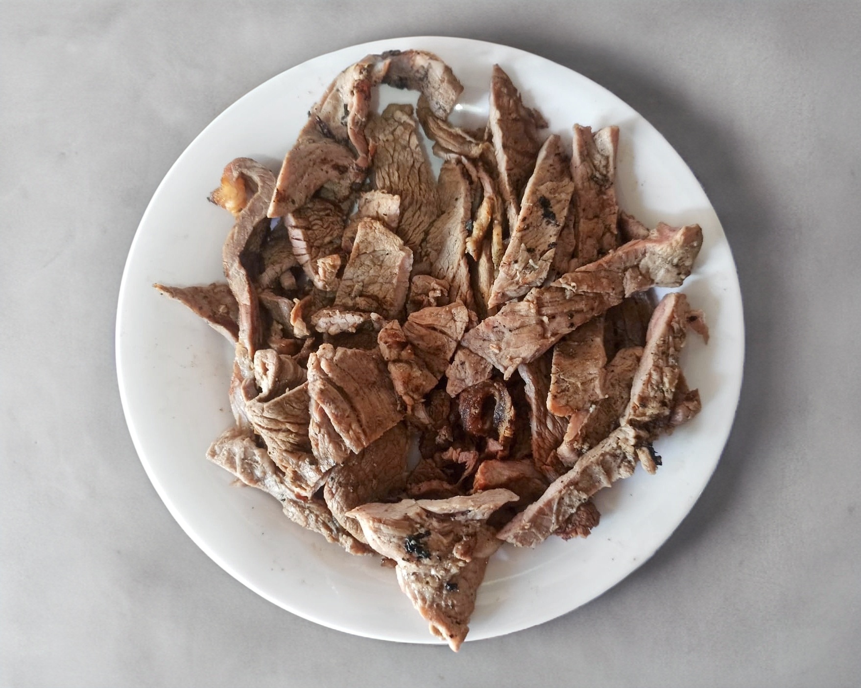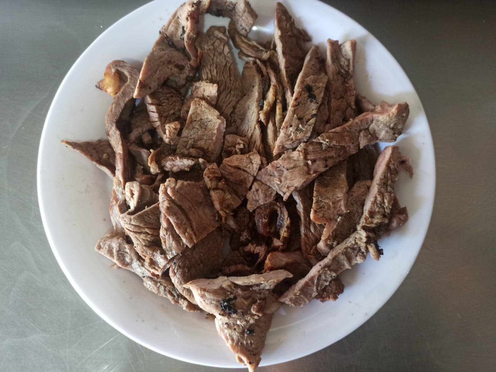 1/4 de kilo de carne, 7 tortillas, frijoles, 1/2 salchicha, 1 cebollita
