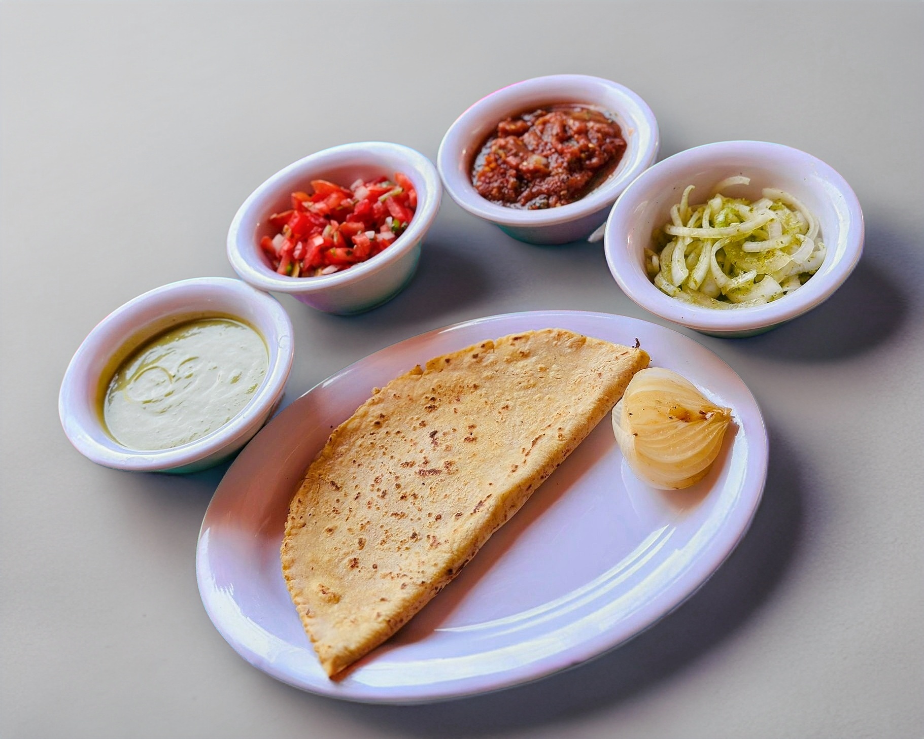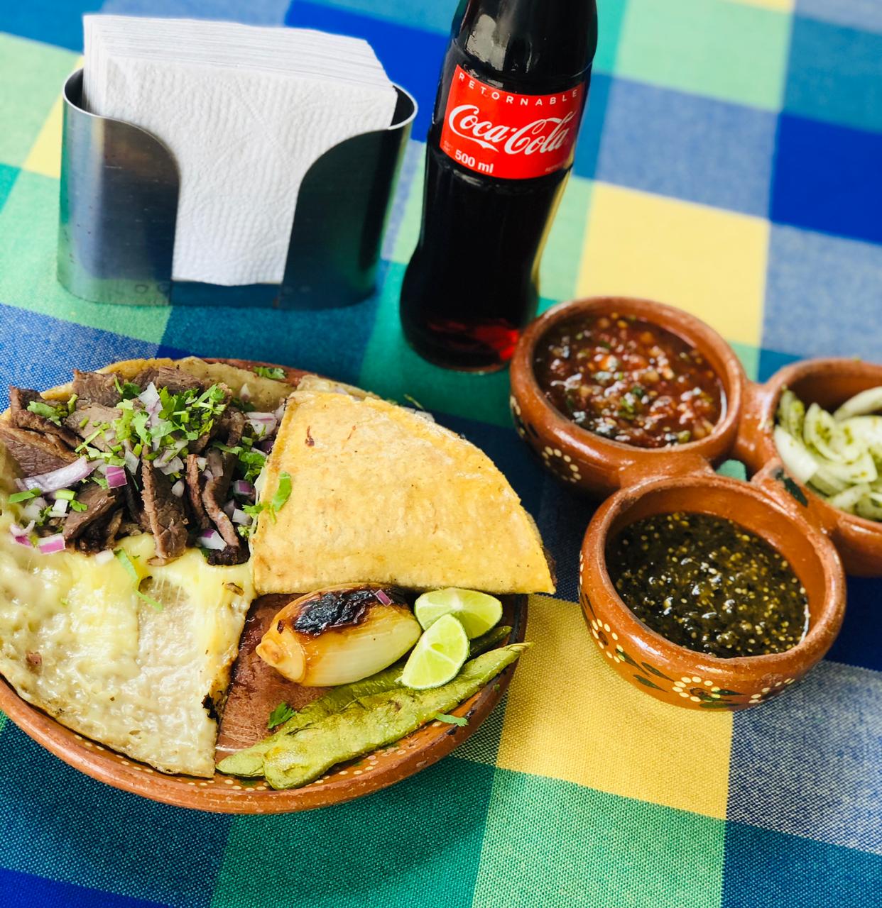 Adobada de cerdo, queso, salsas y tortilla hecha a mano