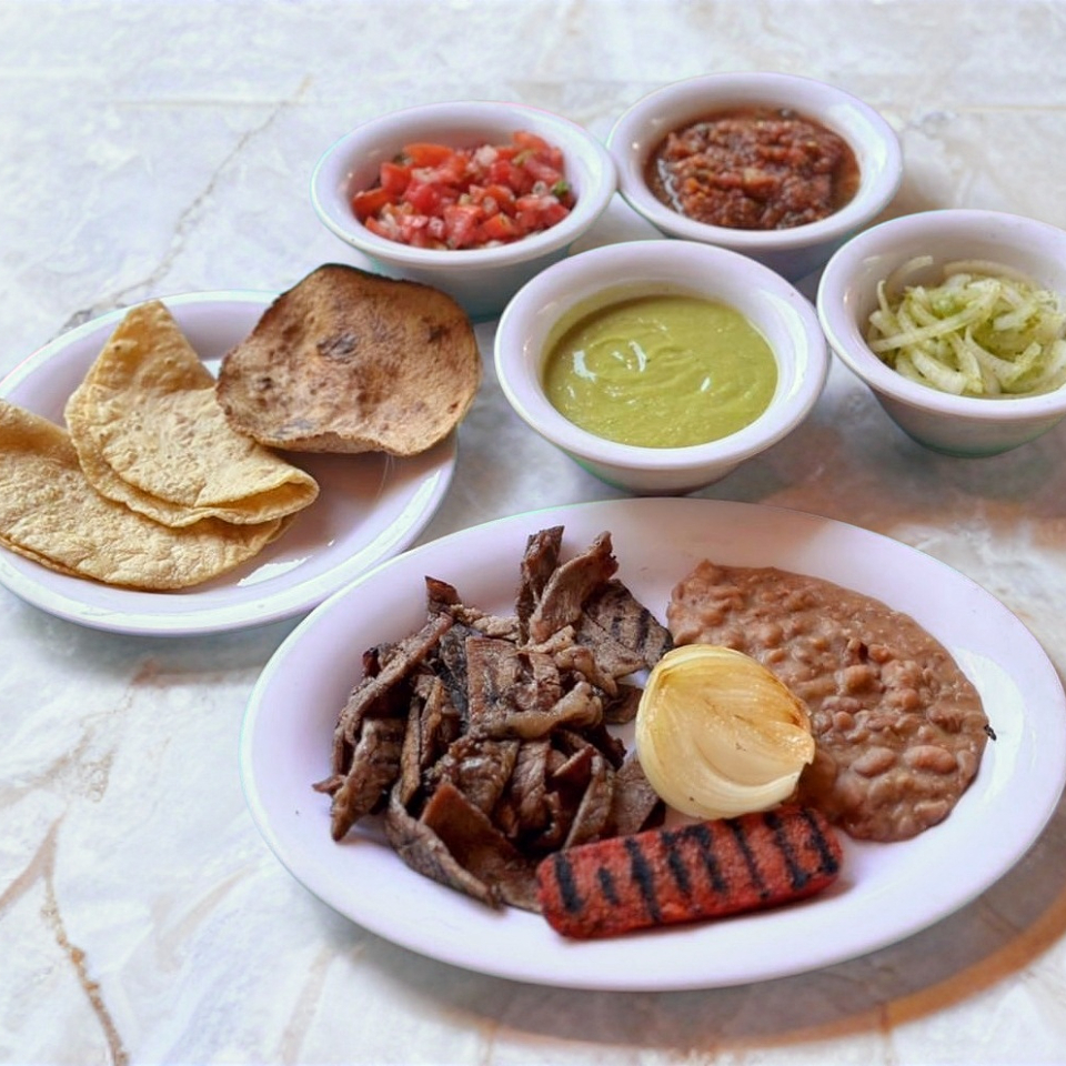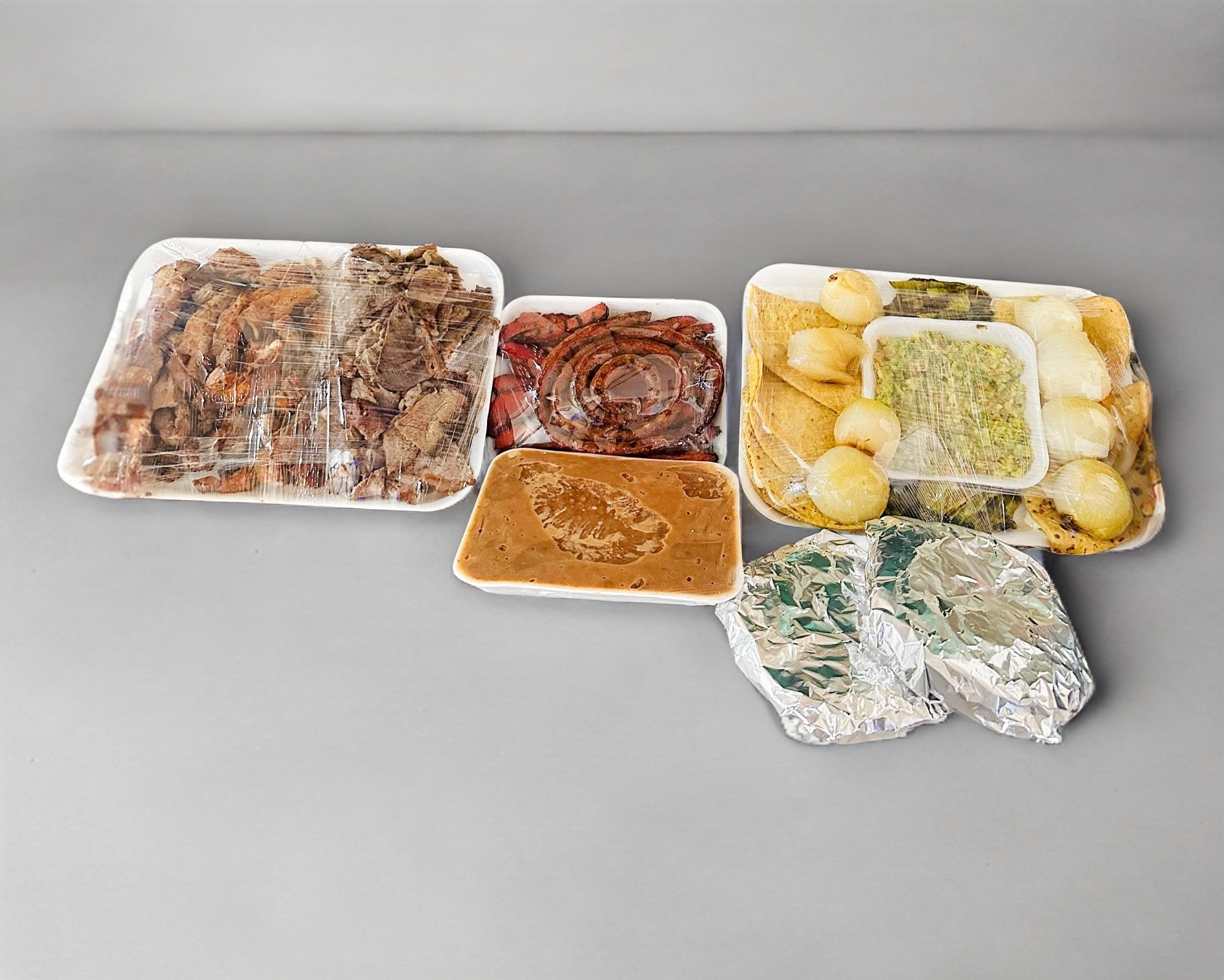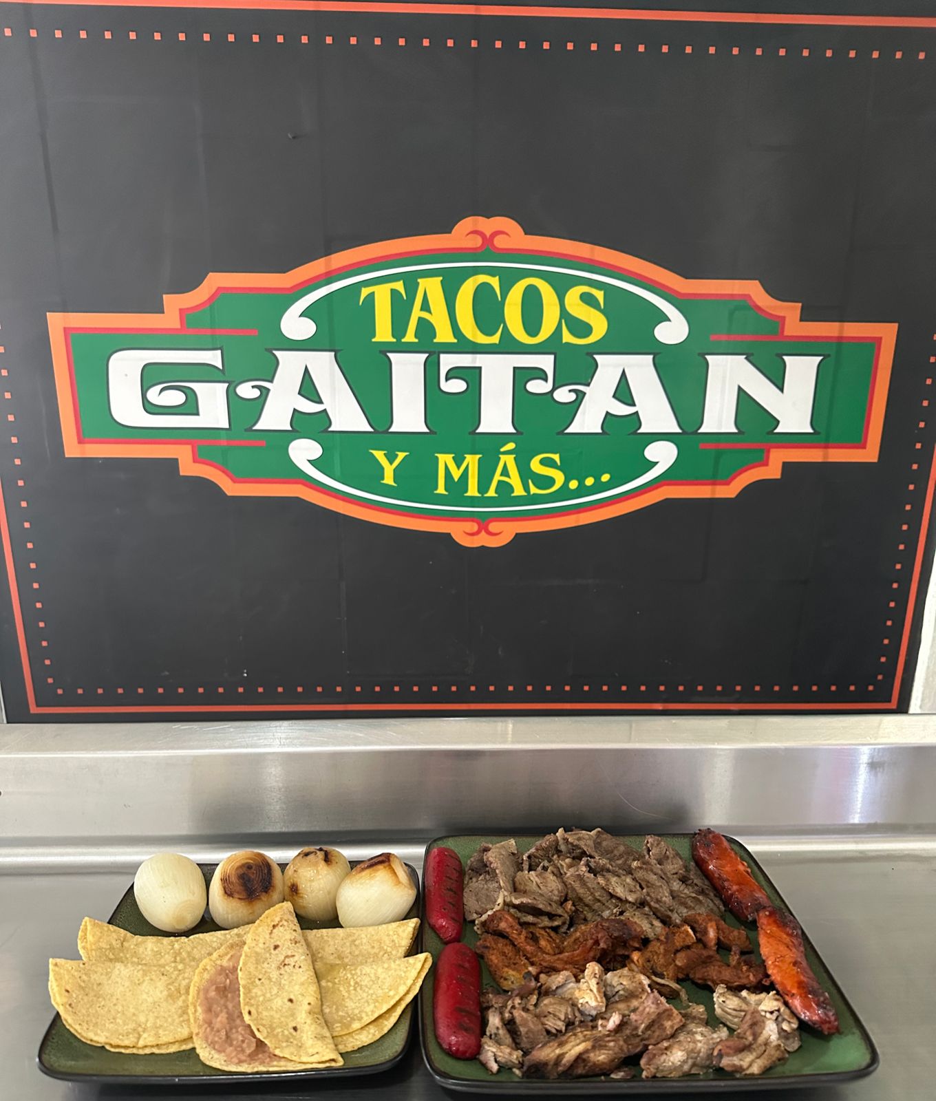Res, adobada y cerdo, 1/2 pza. de chorizo, 1/2 pza. de salchicha, 2 tacos de frijoles, 2 cebollitas y 8 tortillas