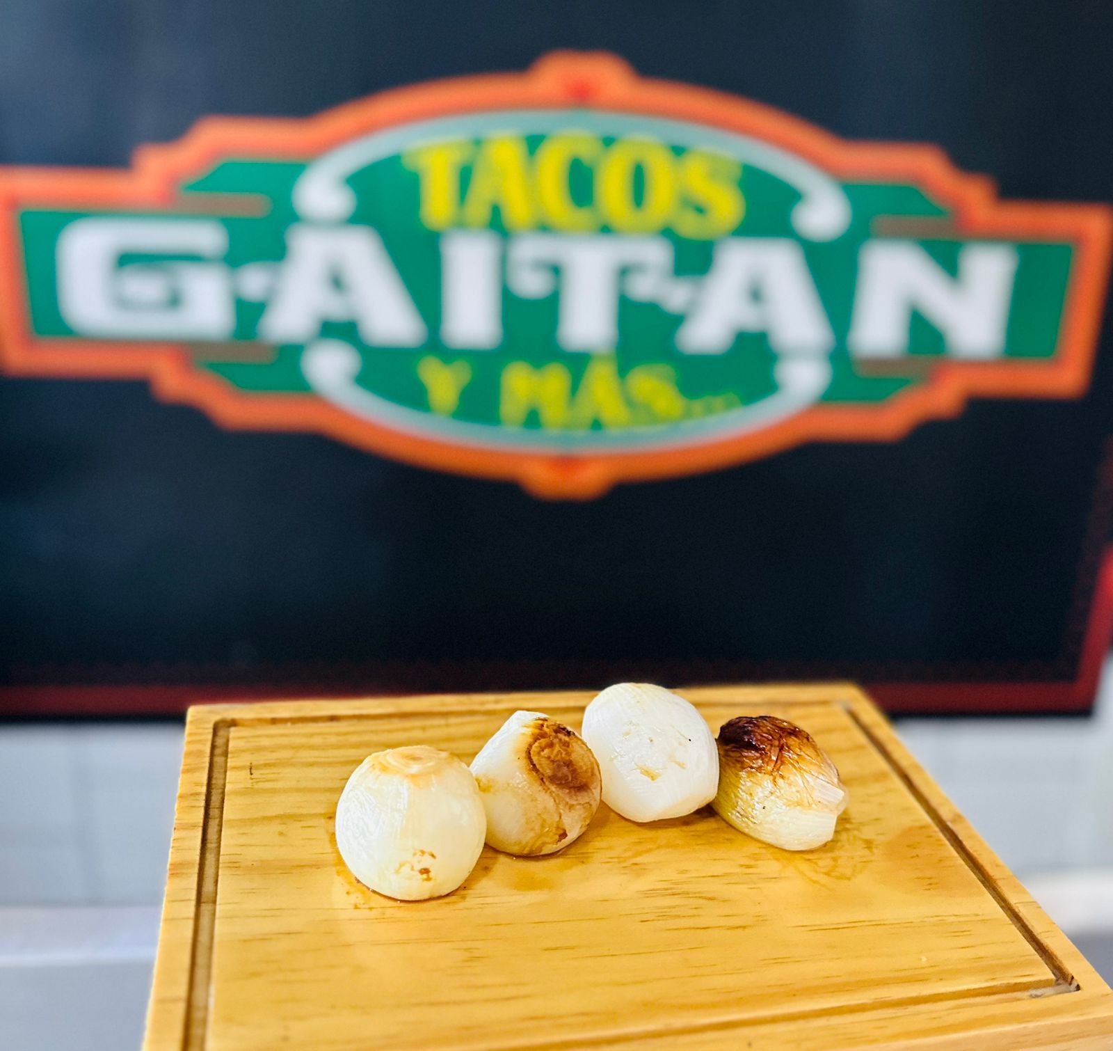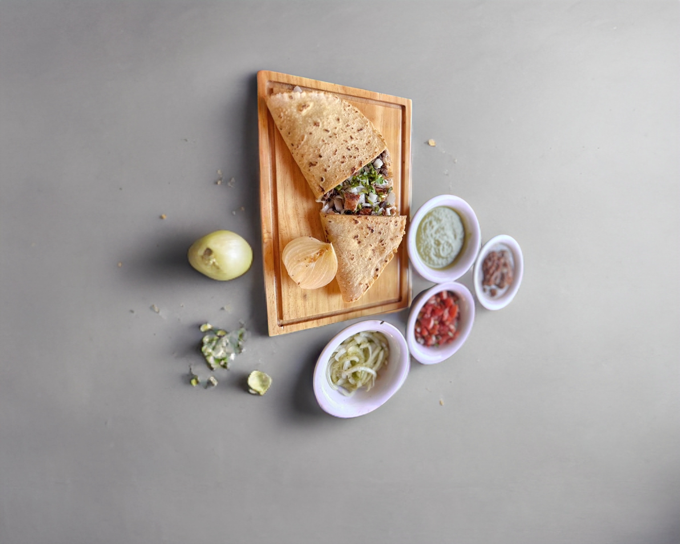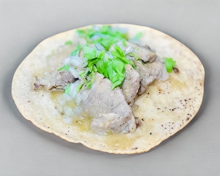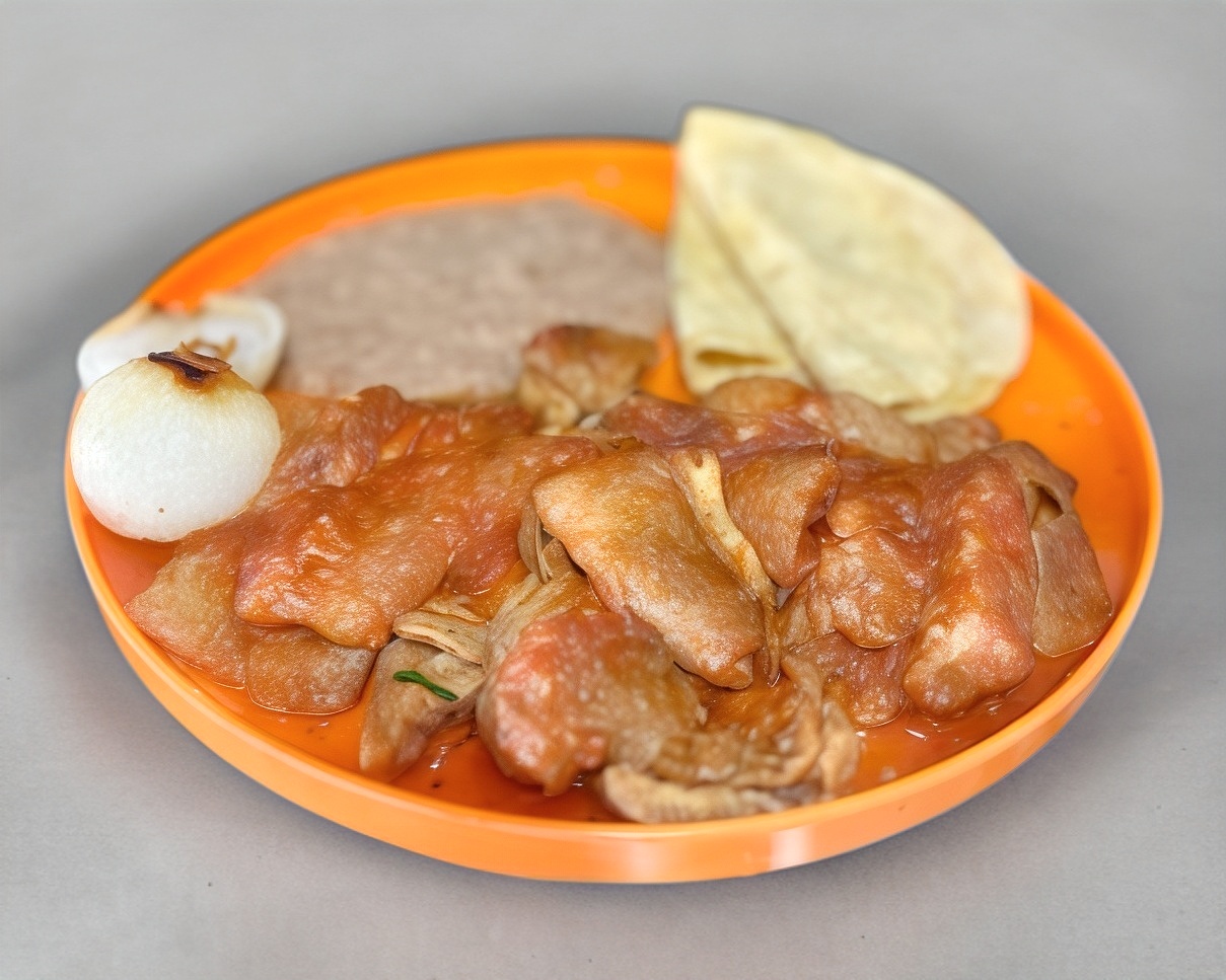 Res, adobada y cerdo, 1/2 pza. de chorizo, 1/2 pza. de salchicha, 2 tacos de frijoles, 2 cebollitas y 8 tortillas
