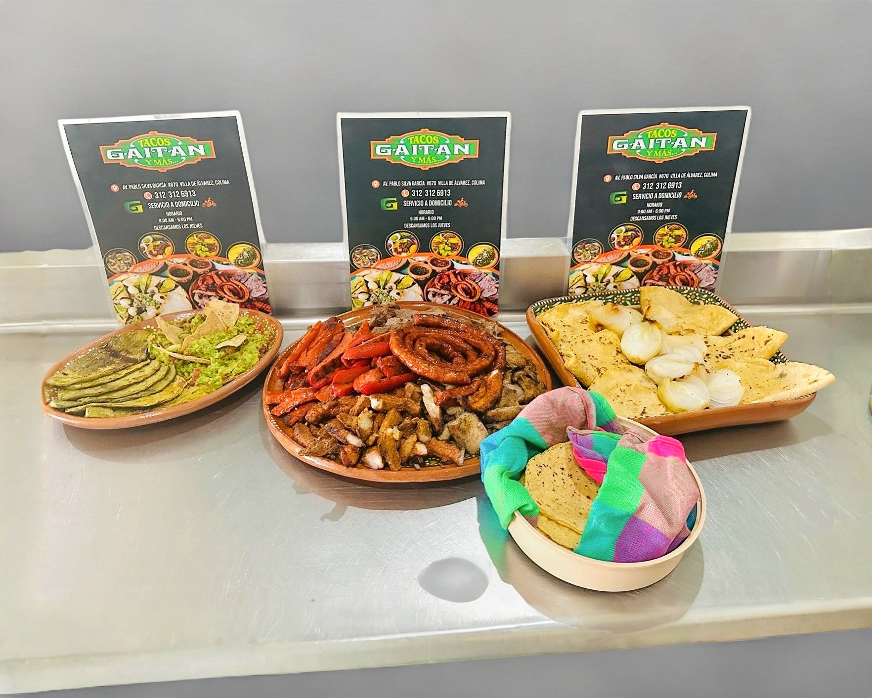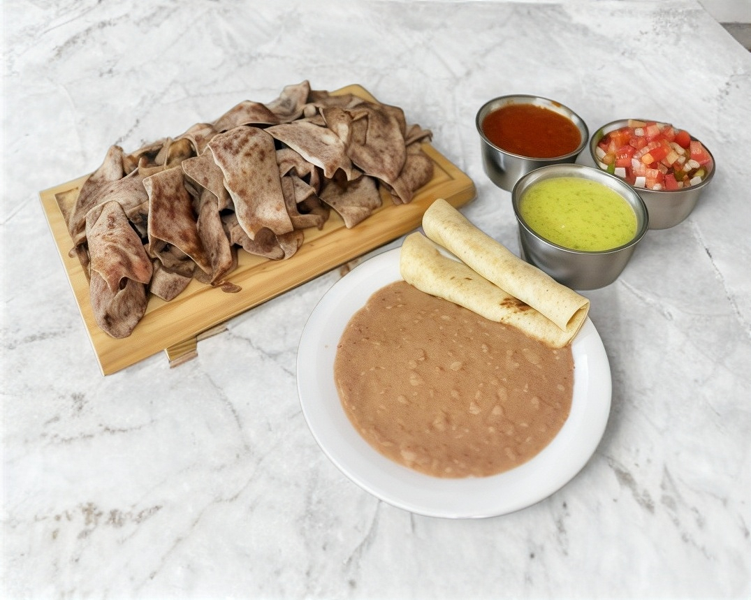 Chorizo corona, queso, salsas y tortilla hecha a mano
