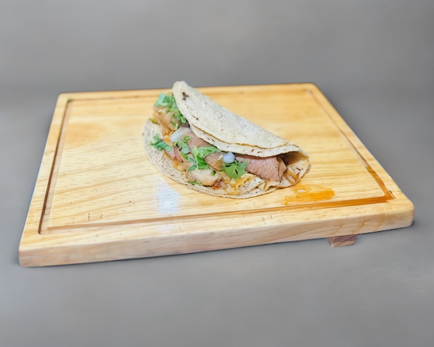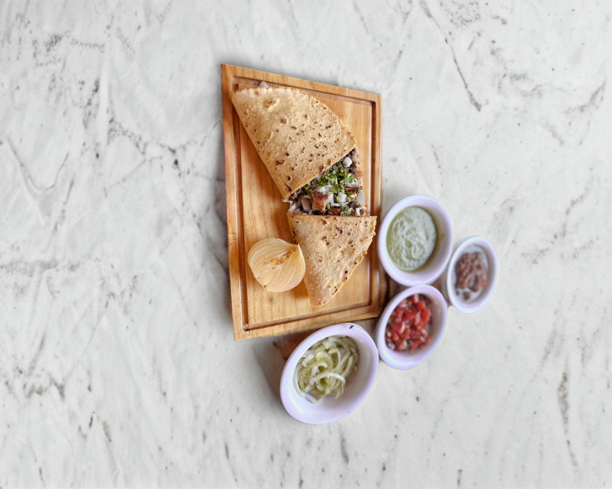 Carne de cerdo Natura, queso, salsas y tortilla hecha a mano