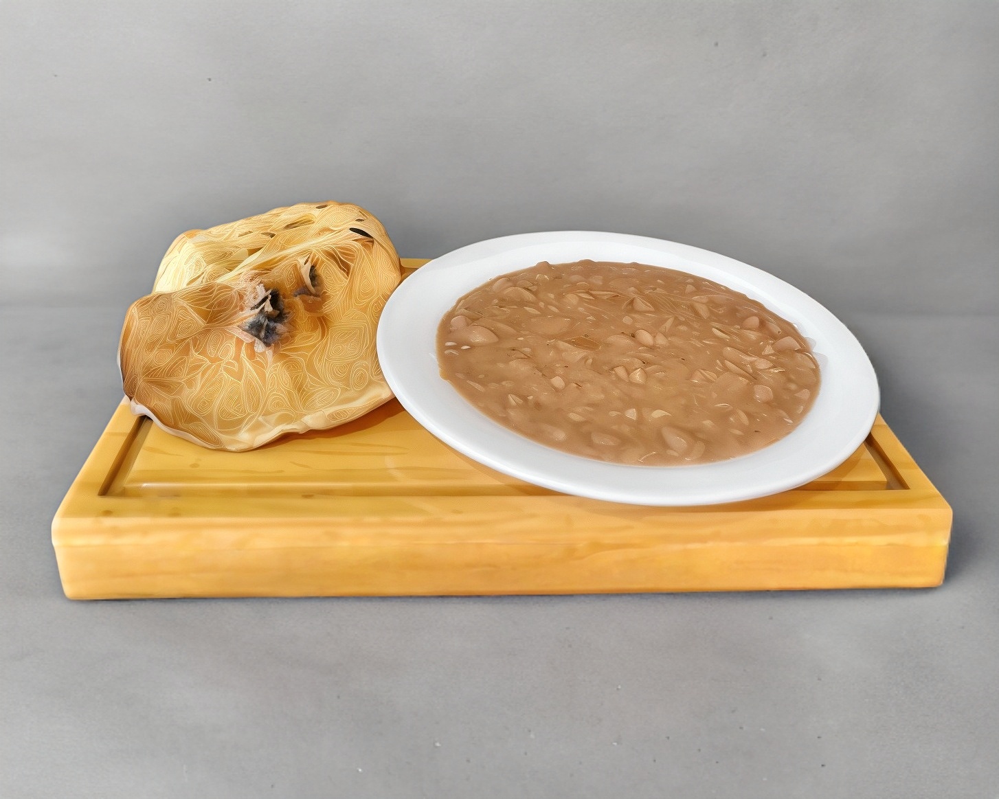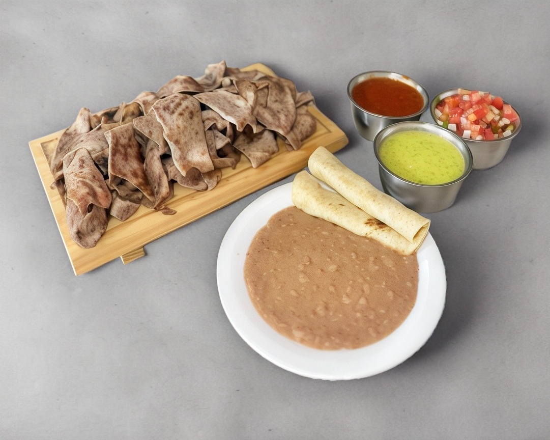 Frijoles, tortillas y cebollita, 1/2 salchicha, doraditas y salsas.