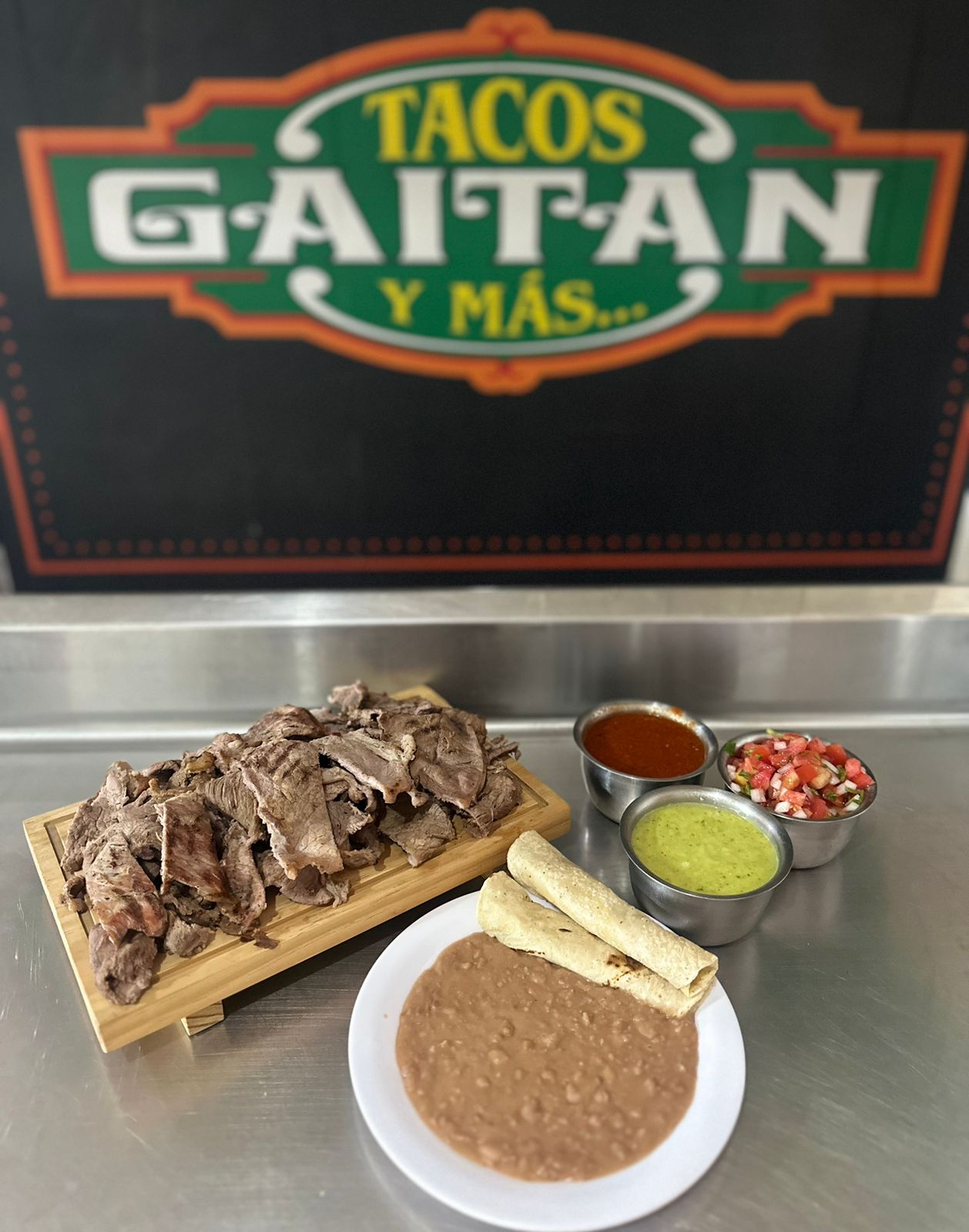 Res, adobada y cerdo, 1 pza. de chorizo, 1 pza. de salchicha, 5 tacos de frijoles, orden de cebollitas y 15 tortillas