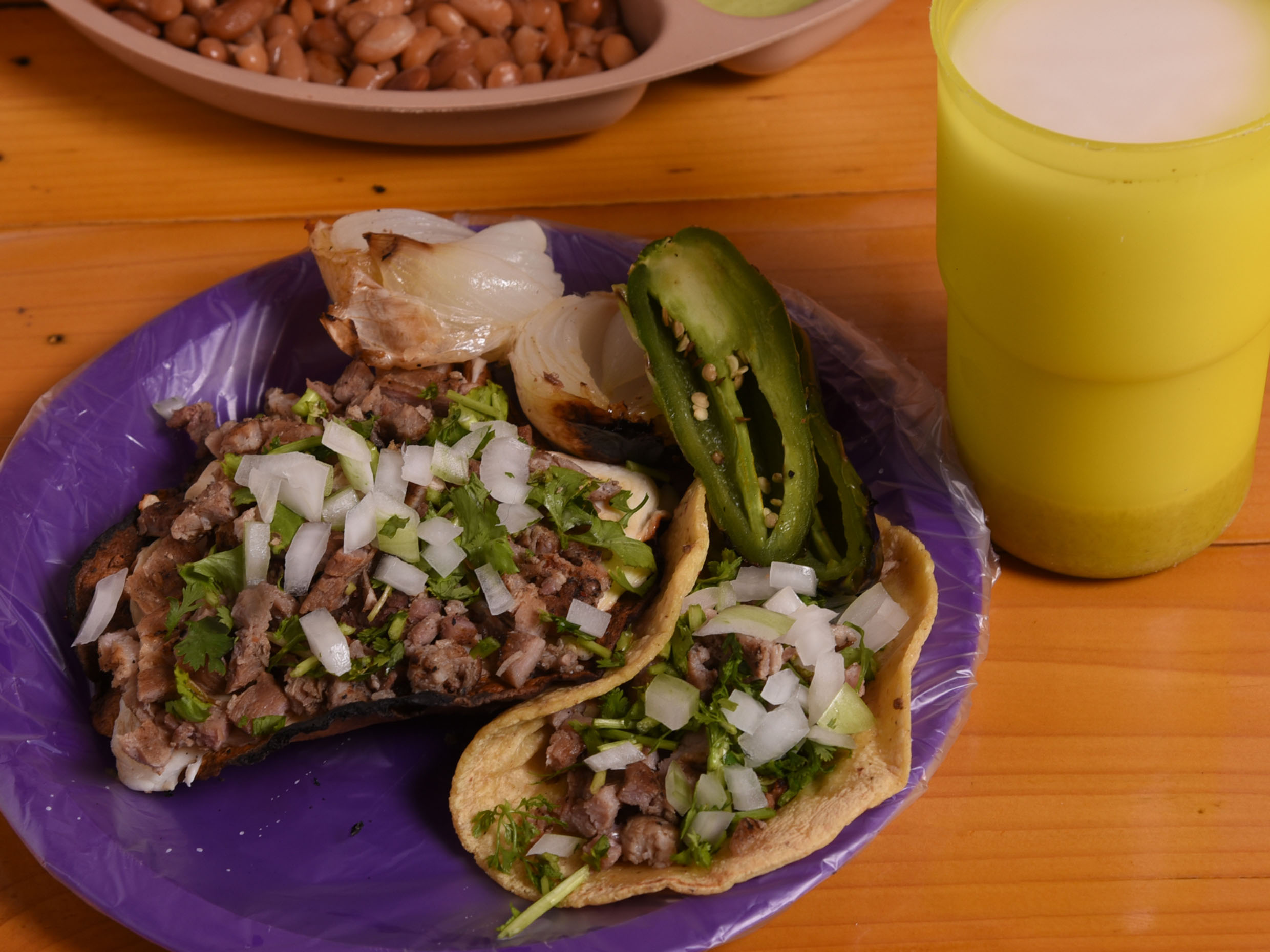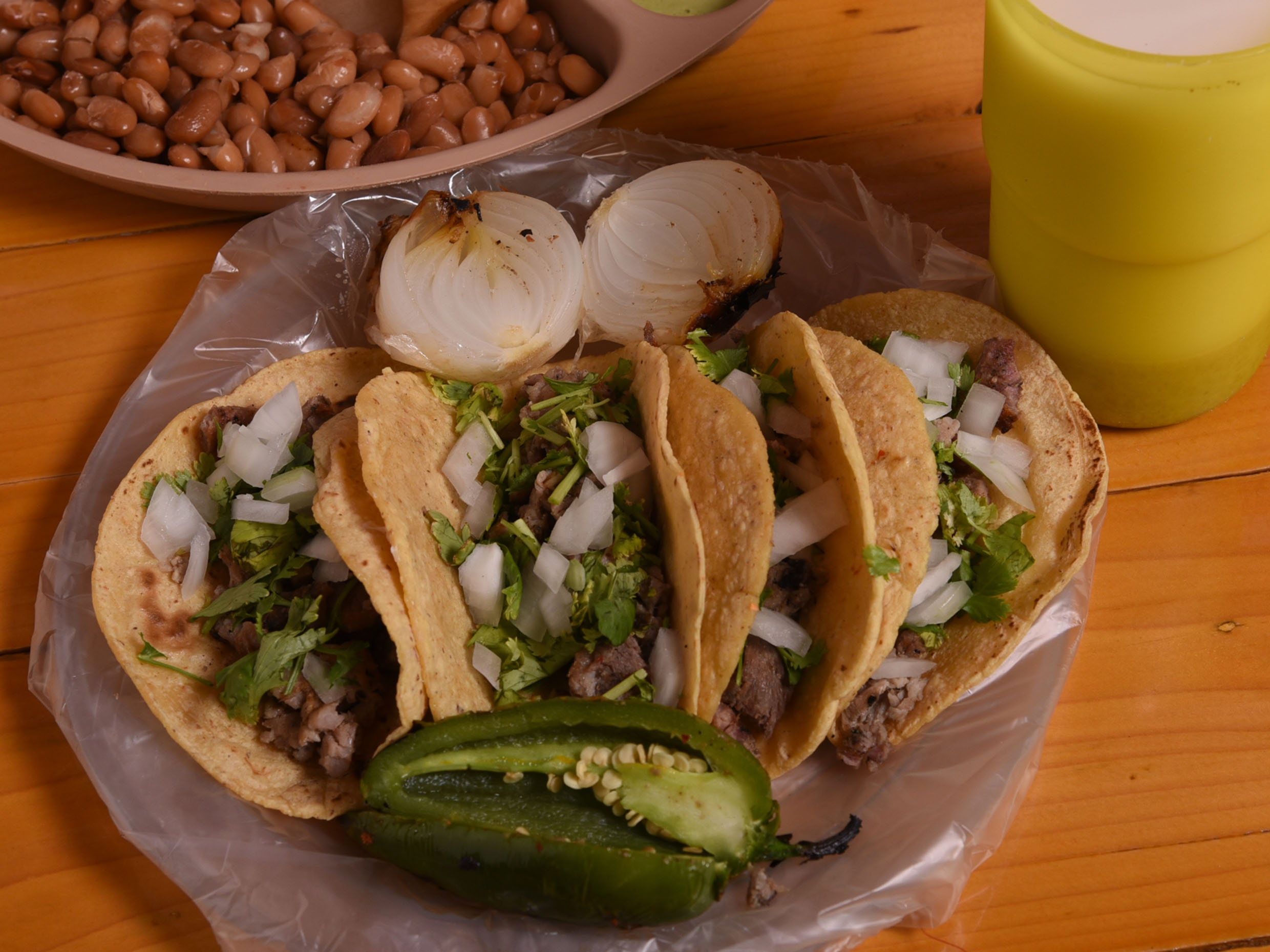 1 tortilla de maíz, y la carne a elegir por el cliente ( porción personal), salsa de tomate, jalapeño y jitomate con frijoles, aparte; cilantro y cebolla