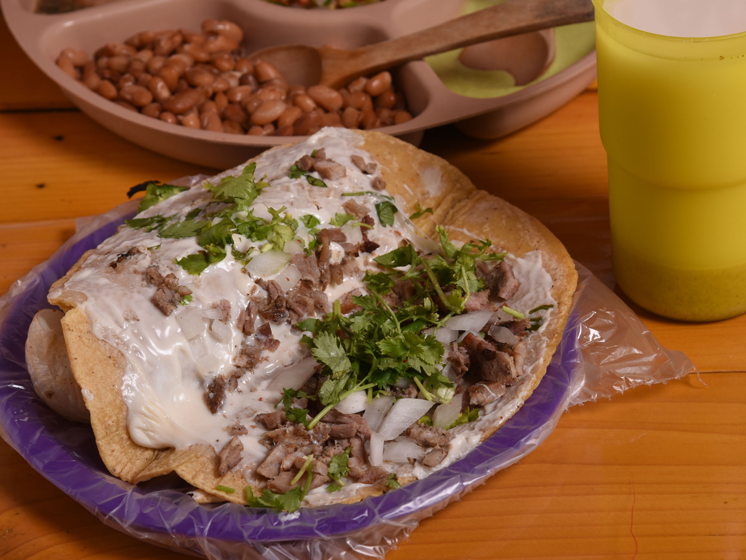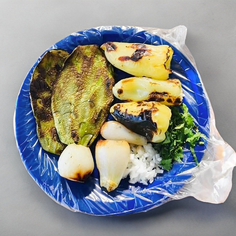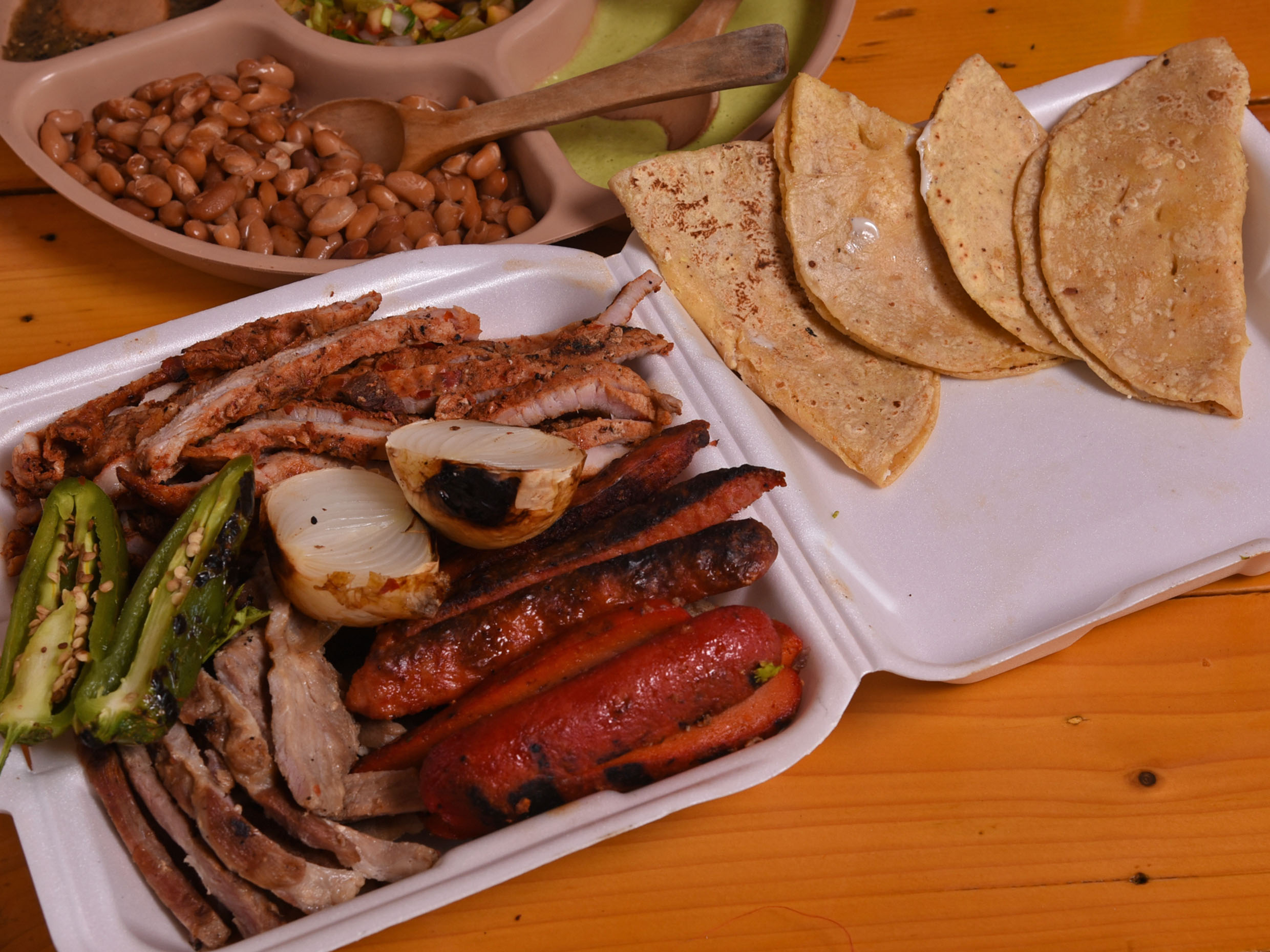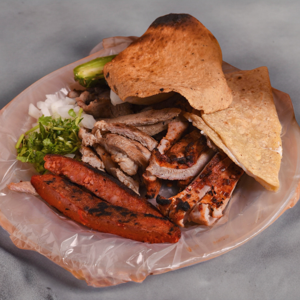 1/4 kg. de carne mixta (Res, cerdo y adobada), 1/4 pza. de chorizo, 1/4 pza. de salchicha, 1 quesadilla, 4 tortillas, salsas y frijoles. Se pesa en crudo. Para una persona.