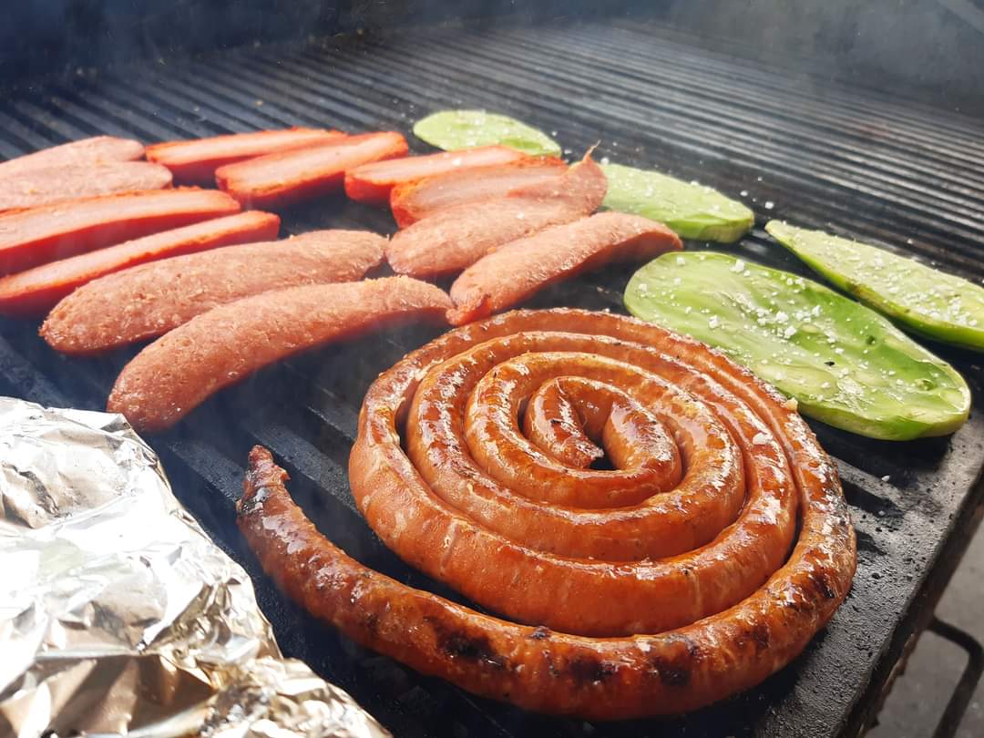 Parrillada para 2 Personas, 1/2 kilo de carne mixta peso en crudo (Res, cerdo y adobada), 1/2 pieza de chorizo de cerdo, 1/2 pieza salchicha kir, 2 quesadillas, 8 tortillas de maíz, salsas(tomate, jalapeño y jitomate) y frijoles (porción para 2 personas )