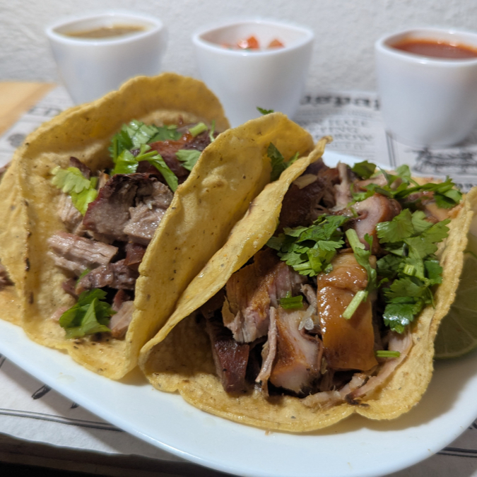 Taco de carnitas 50g, carne a elegir + acompañamientos.