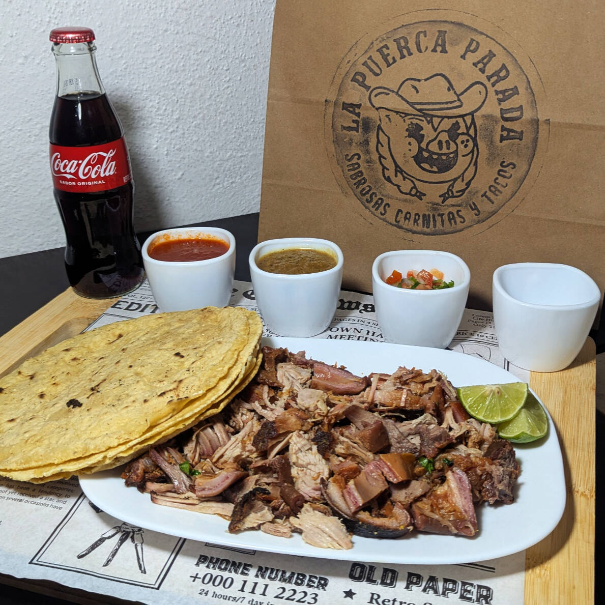 160g de carnitas, carne a elegir, 4 tortillas + 150g de frijolitos de la puerca + acompañamientos.