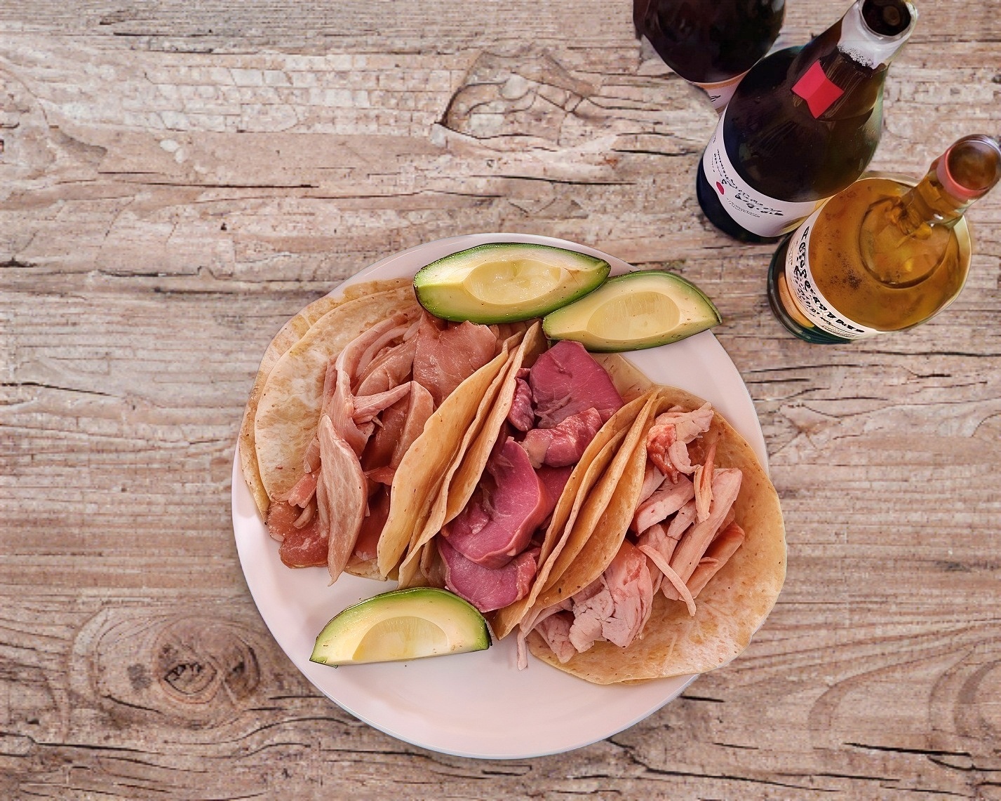 Porción completa de carnitas de 220 g. con aguacate, tortillas y salsas