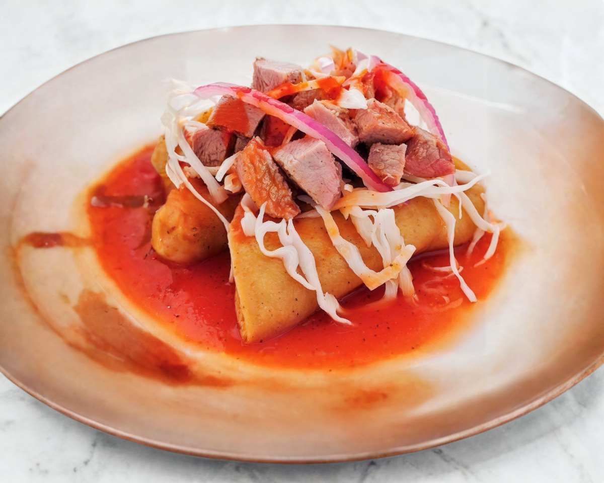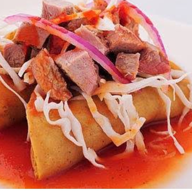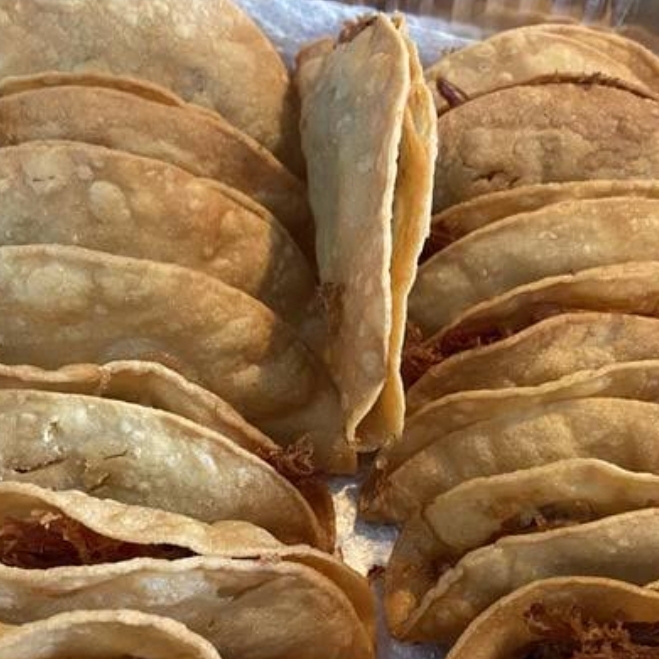 Orden de tacos dorados rellenos de carnitas.