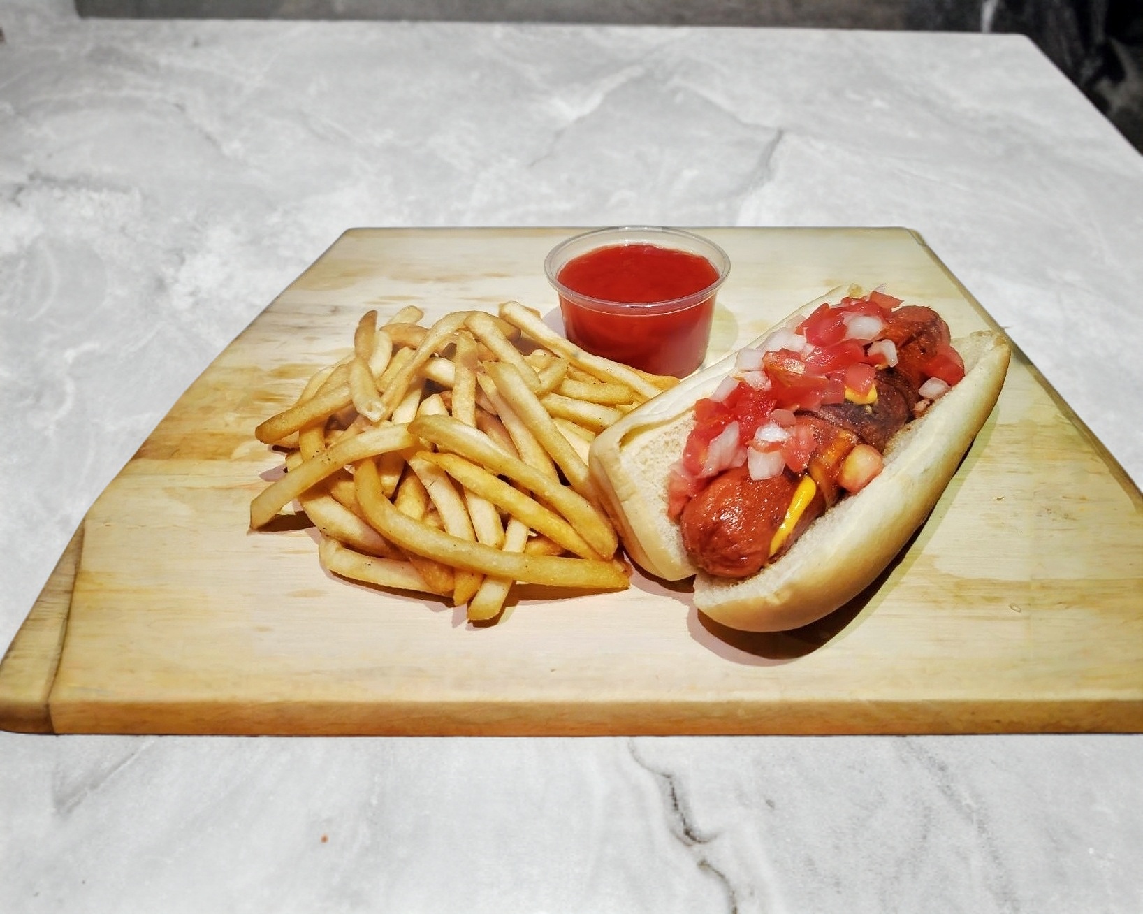 SALCHICHA DE PAVO RELLENA DE QUESO AMARILLO Y ENVUELTA EN TOCINO, UNA REBANADA DE JAMÓN Y UNA REBANADA DE QUESO AMARILLO. INCLUYE PAPAS