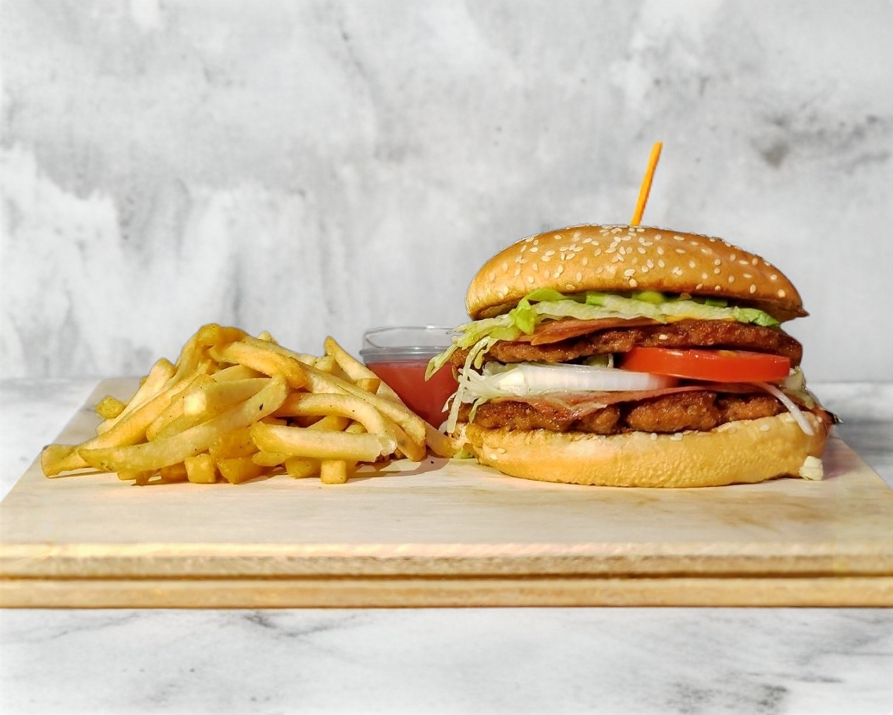 TRIPLE CARNE CASERA, JAMÓN, QUESO AMARILLO, VEGETALES Y PAPAS A LA FRANCESA