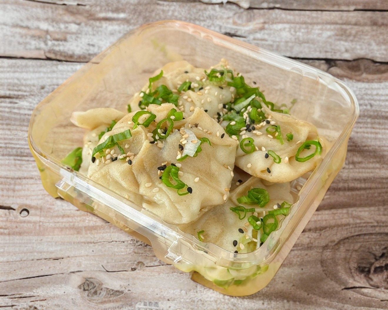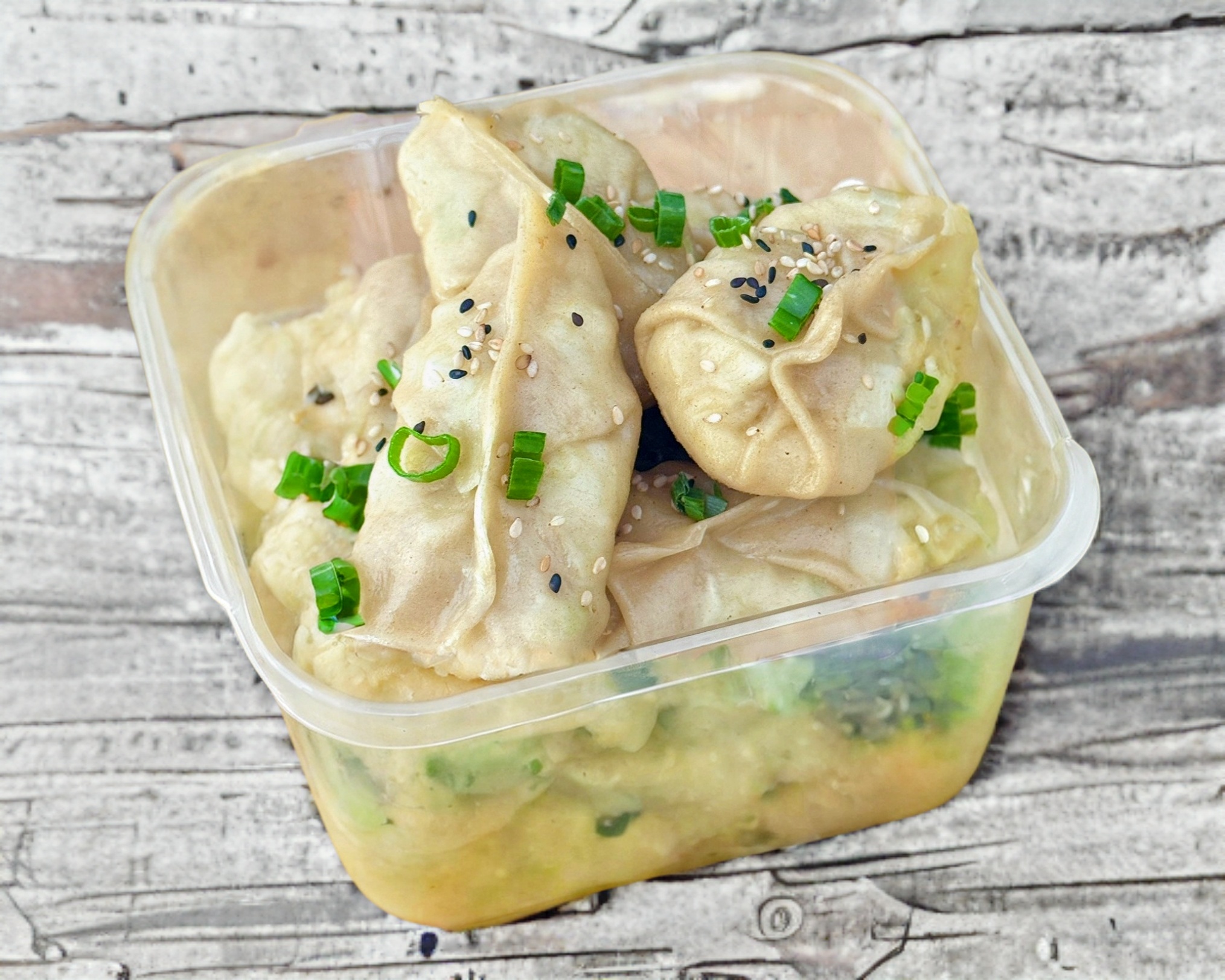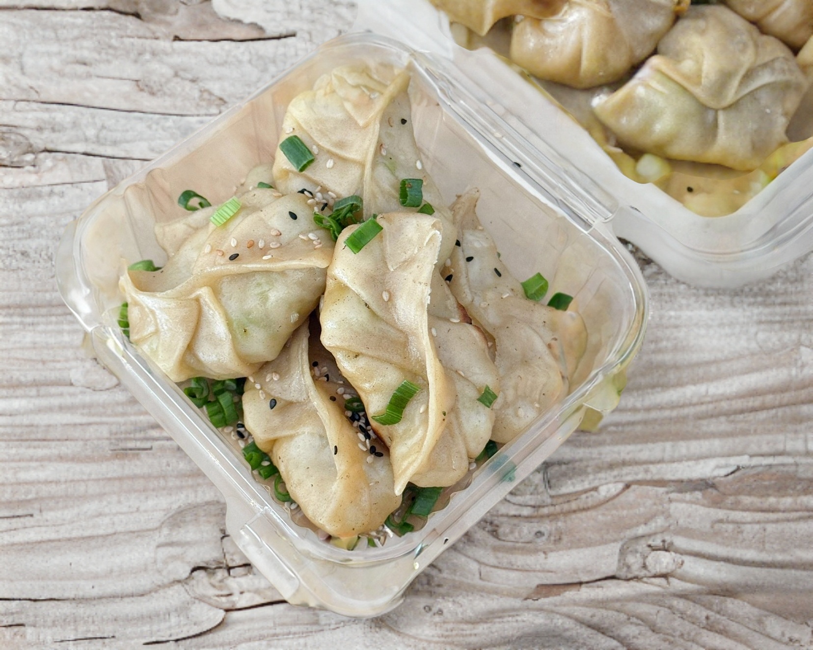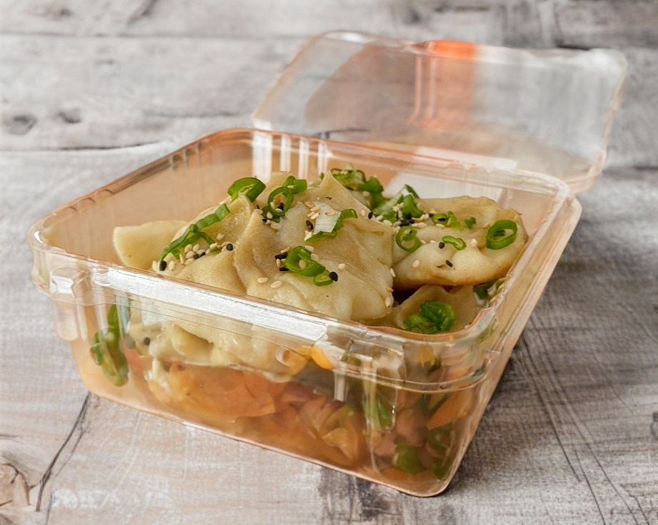 2 dumplings de soya, 2 dumplings de champiñon y 2 dumplings de tofu. Esta orden incluye 2 salsas (1 soya y 1 chili oil).