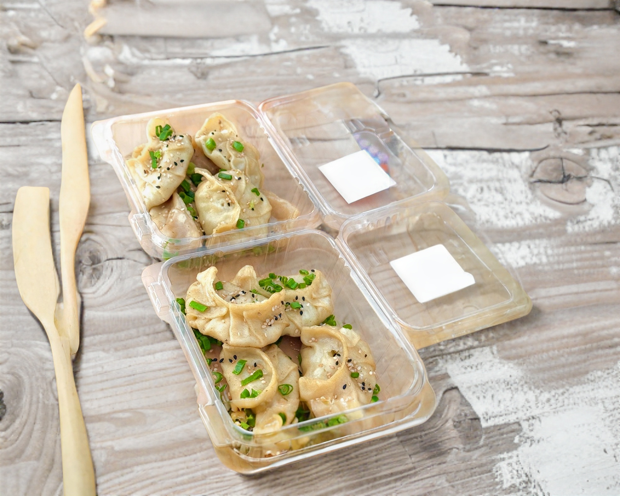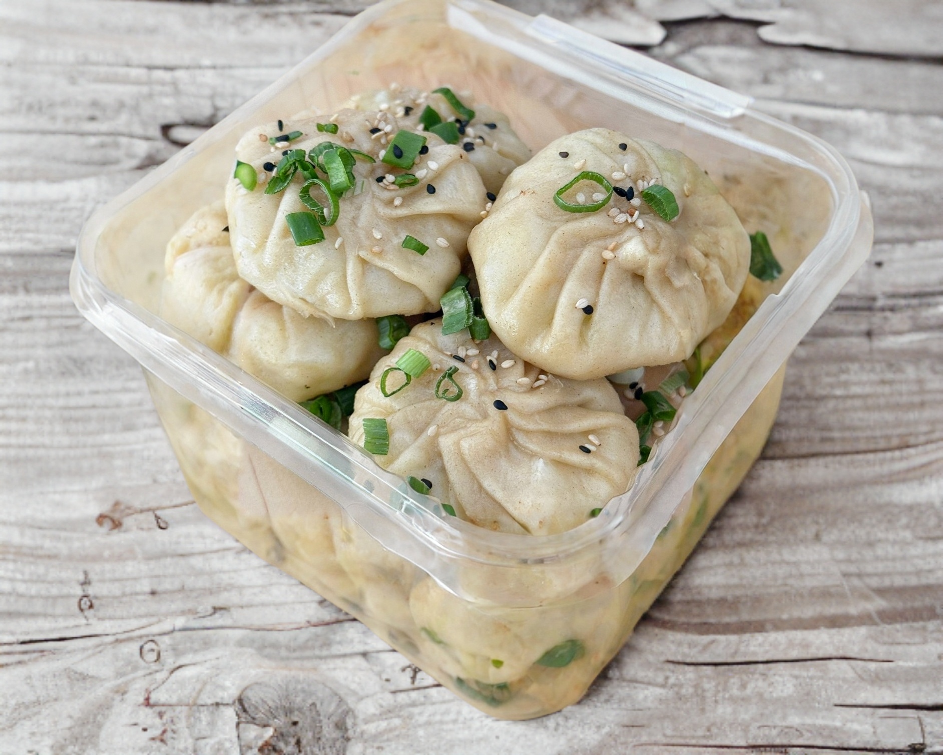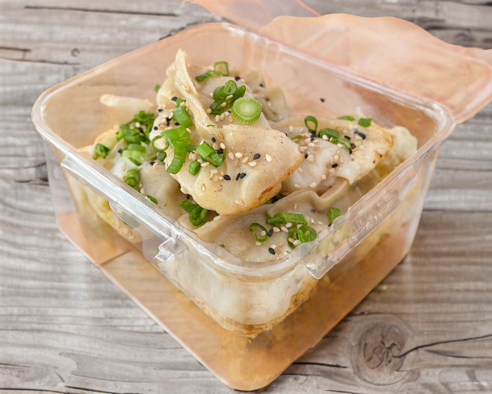 6 dumplings rellenos de molida de res con vegetales y especias. esta orden incluye 2 salsas (1 soya y 1 chili oil).topping cebollín y ajonjolí.