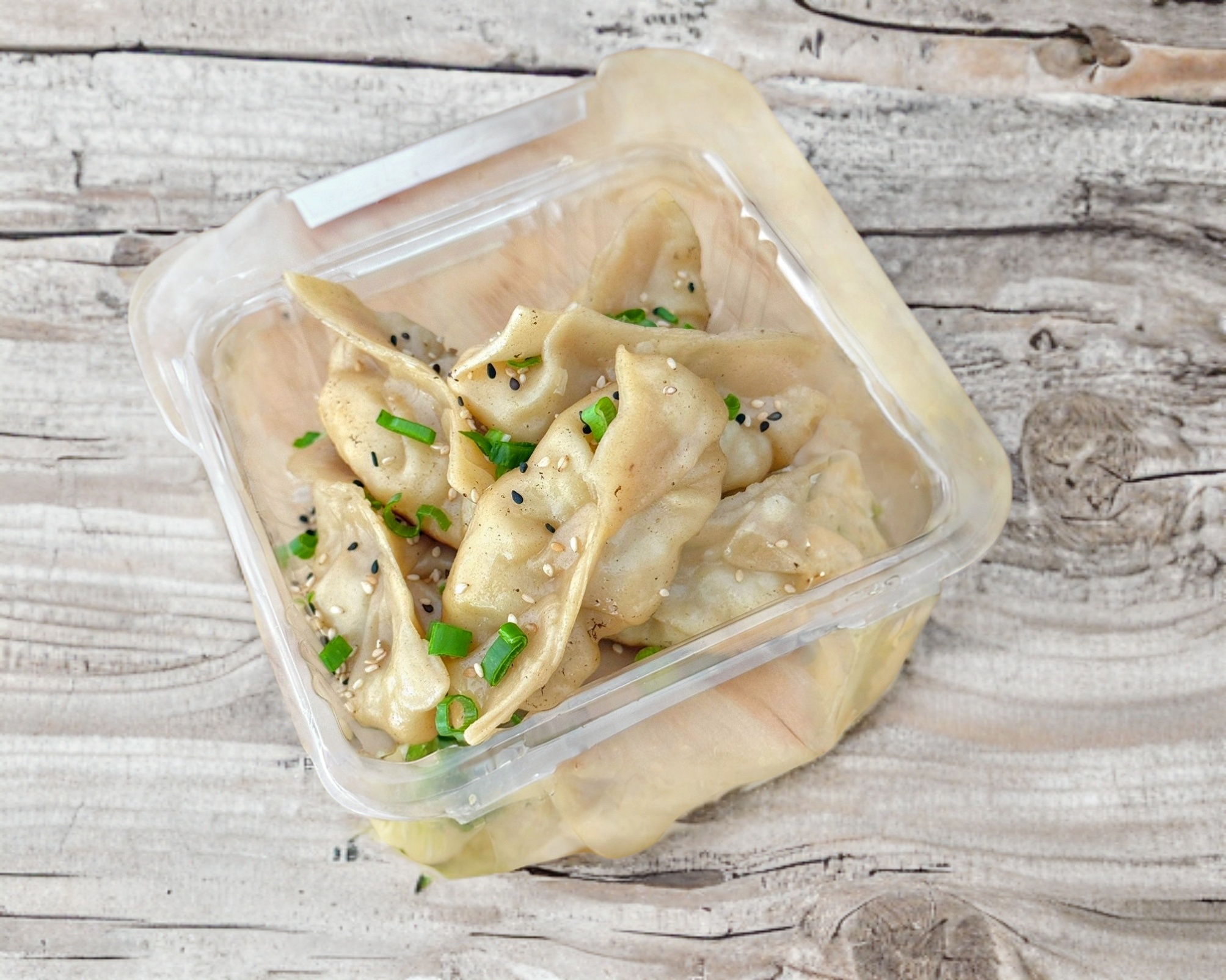 6 dumplings rellenos de tofú con cebollín, ajonjolí y especias. esta orden incluye 2 salsas (1 soya y 1 chili oil).