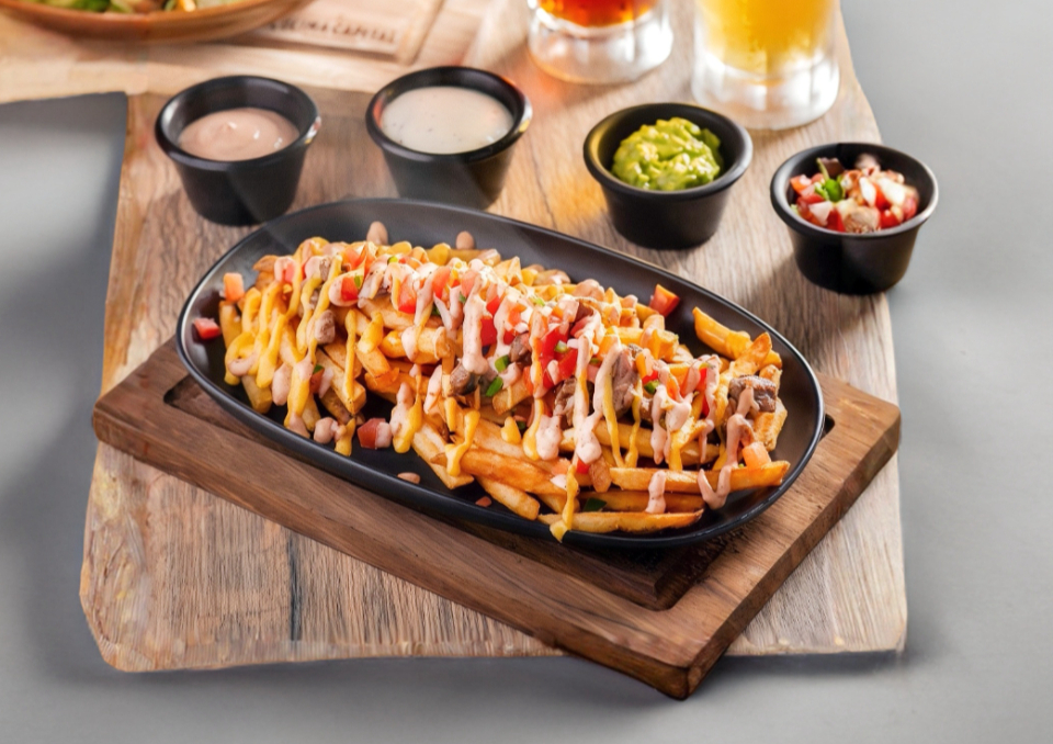 Papas a la francesa, papas gajo, arrachera, guacamole, pico de gallo, tocino y aderezo chipotle