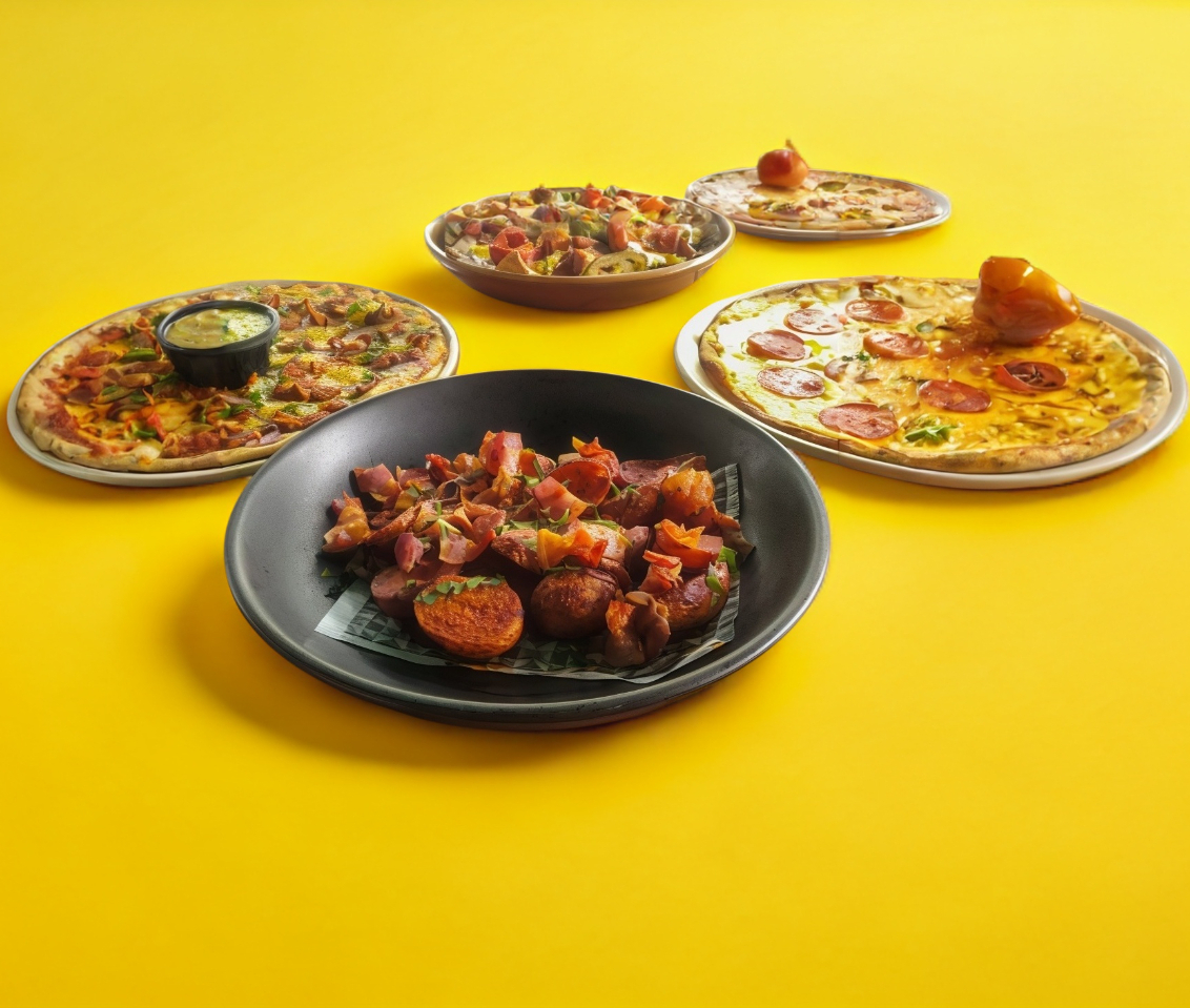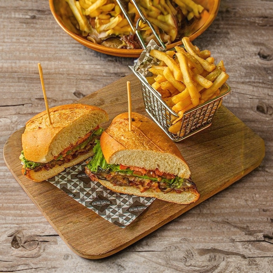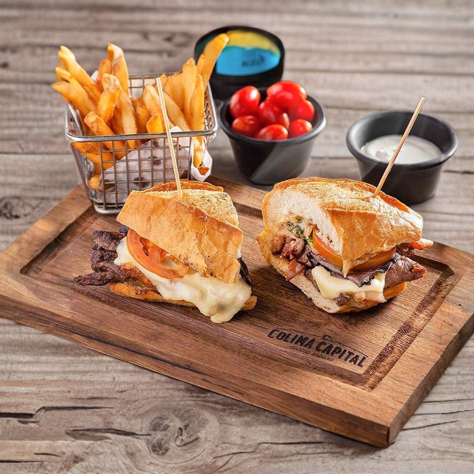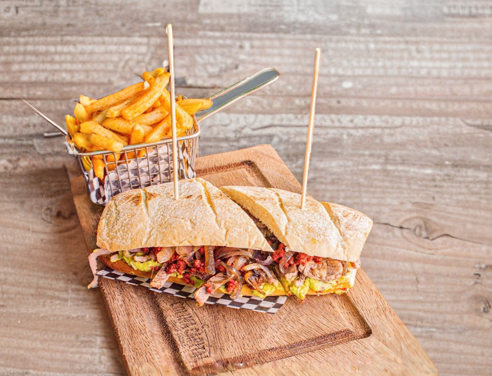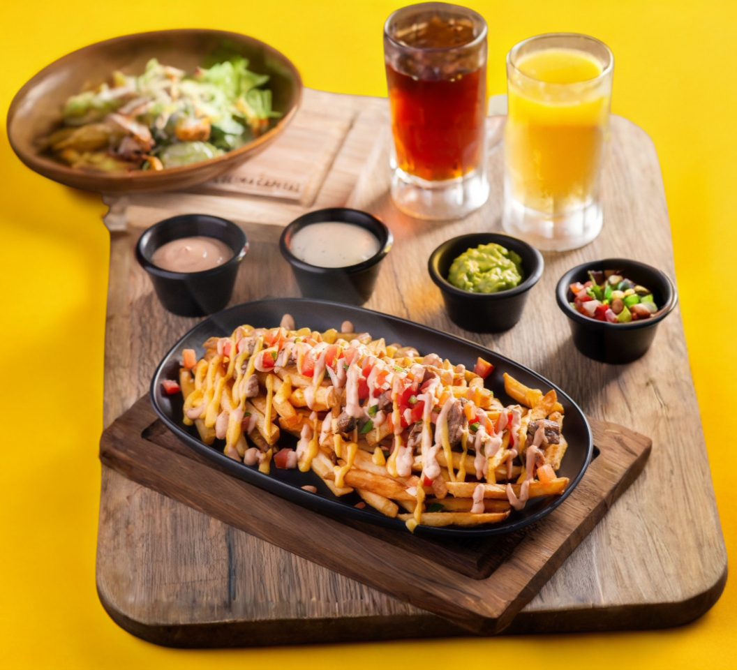 Papas a la francesa, papas gajo, arrachera, guacamole, pico de gallo, tocino y aderezo chipotle