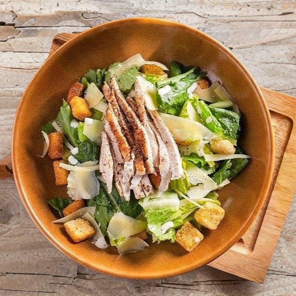 Lechuga orejona, pechuga de pollo a la parrilla, crotones, queso parmesano y aderezo césar clásico