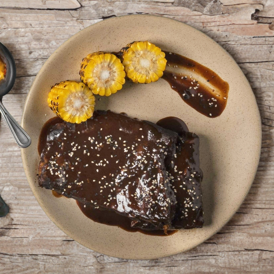 Costillas de cerdo bañadas en salsa BBQ y acompañadas de elote cocido