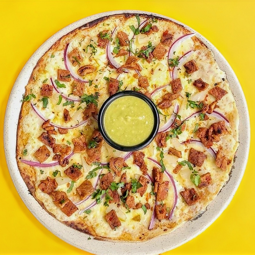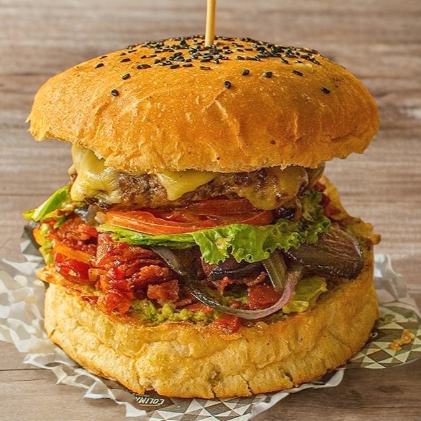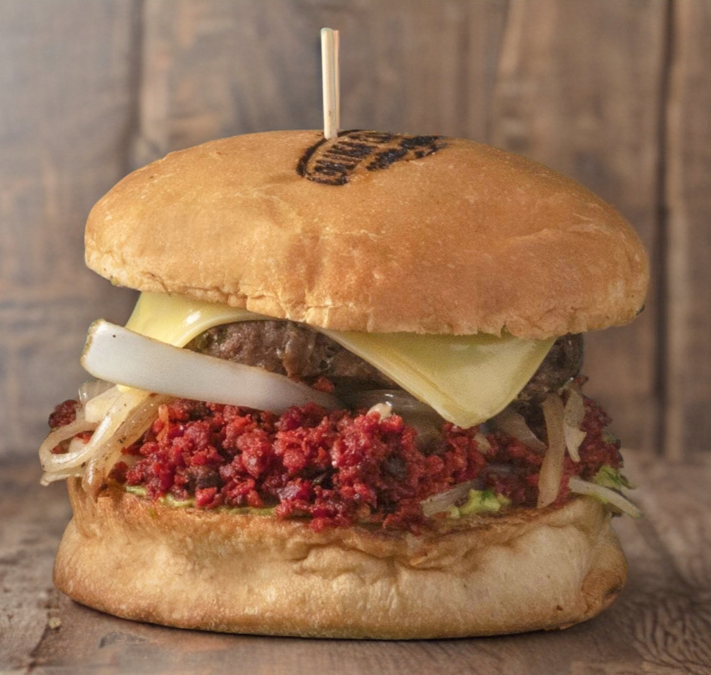 Arrachera, queso gouda, cebolla frita, chile toreado, lechuga y jitomate