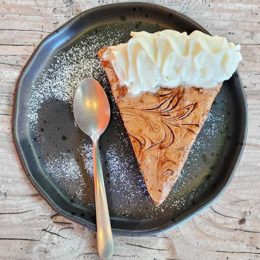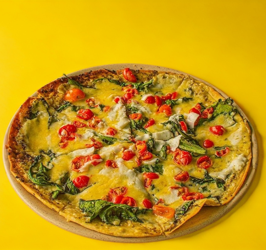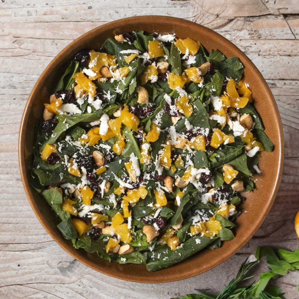 Espinaca, queso de cabra, nuez de la india, arándanos y cubitos de durazno con vinagreta dulce