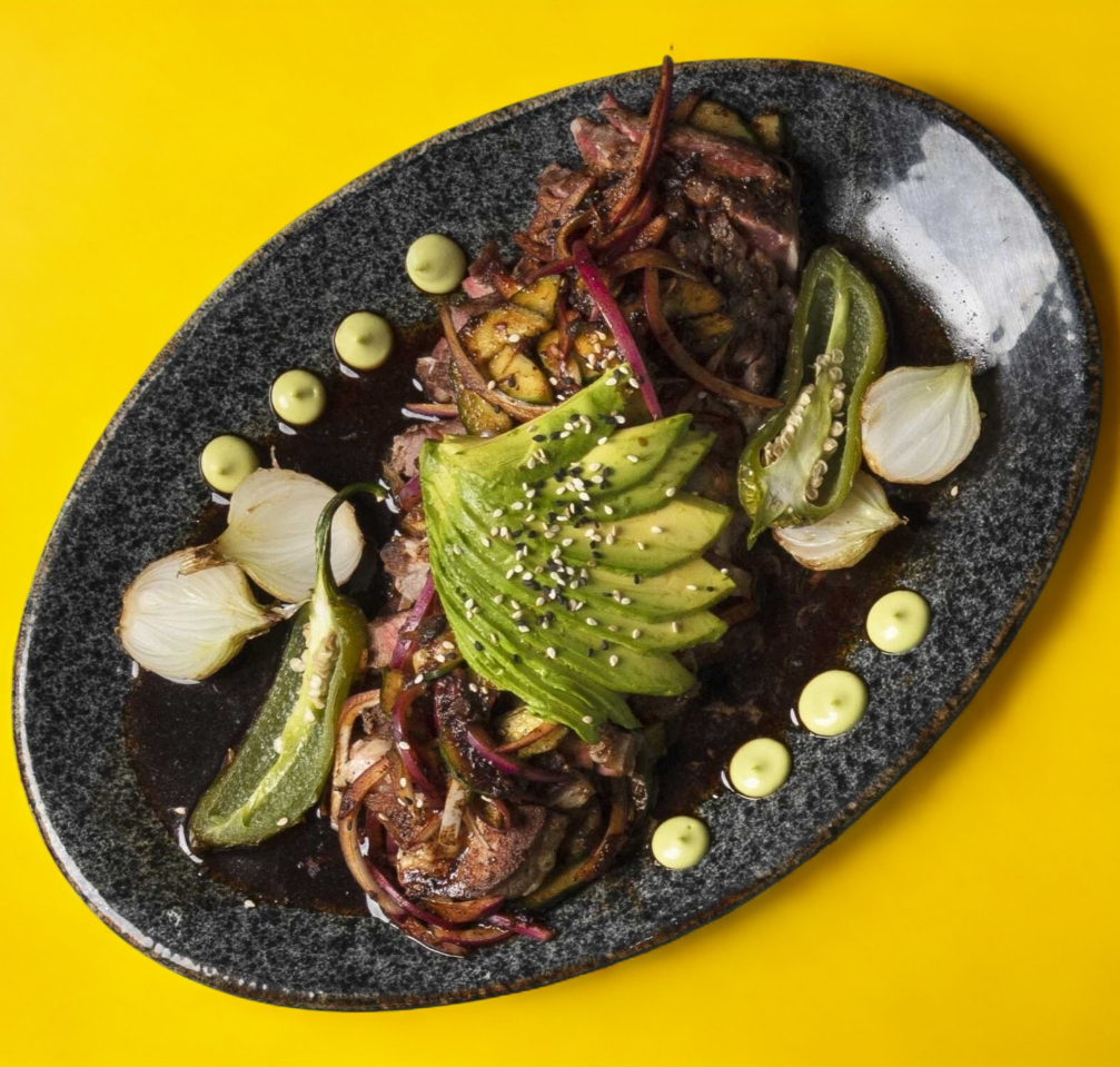 Ribeye sellado y marinado con salsa de aguachile negro, pepino y cebolla morada