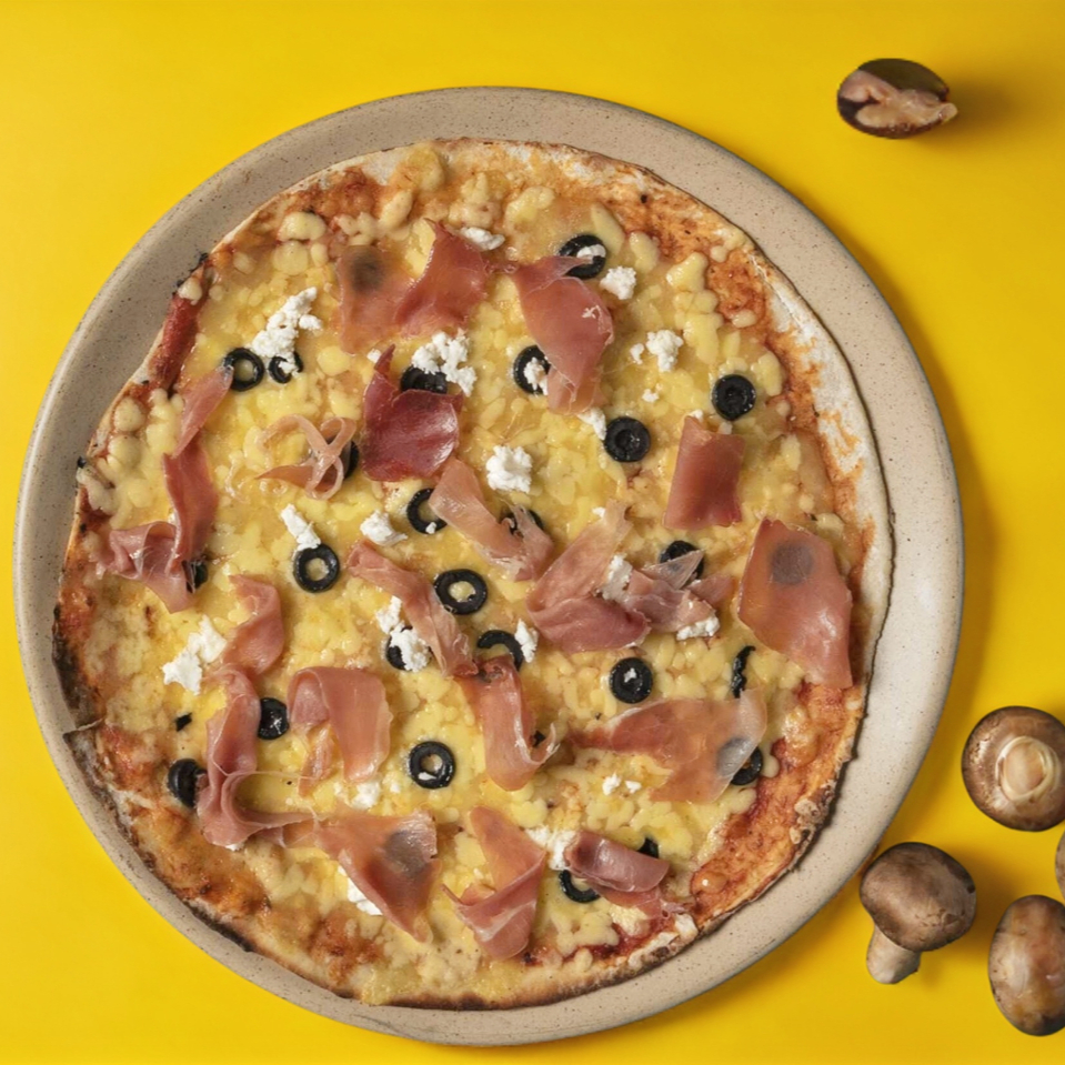 Mezcla de lechugas, jitomate, pimiento morrón, aceitunas negras, pepino, queso de cabra y vinagreta de la casa