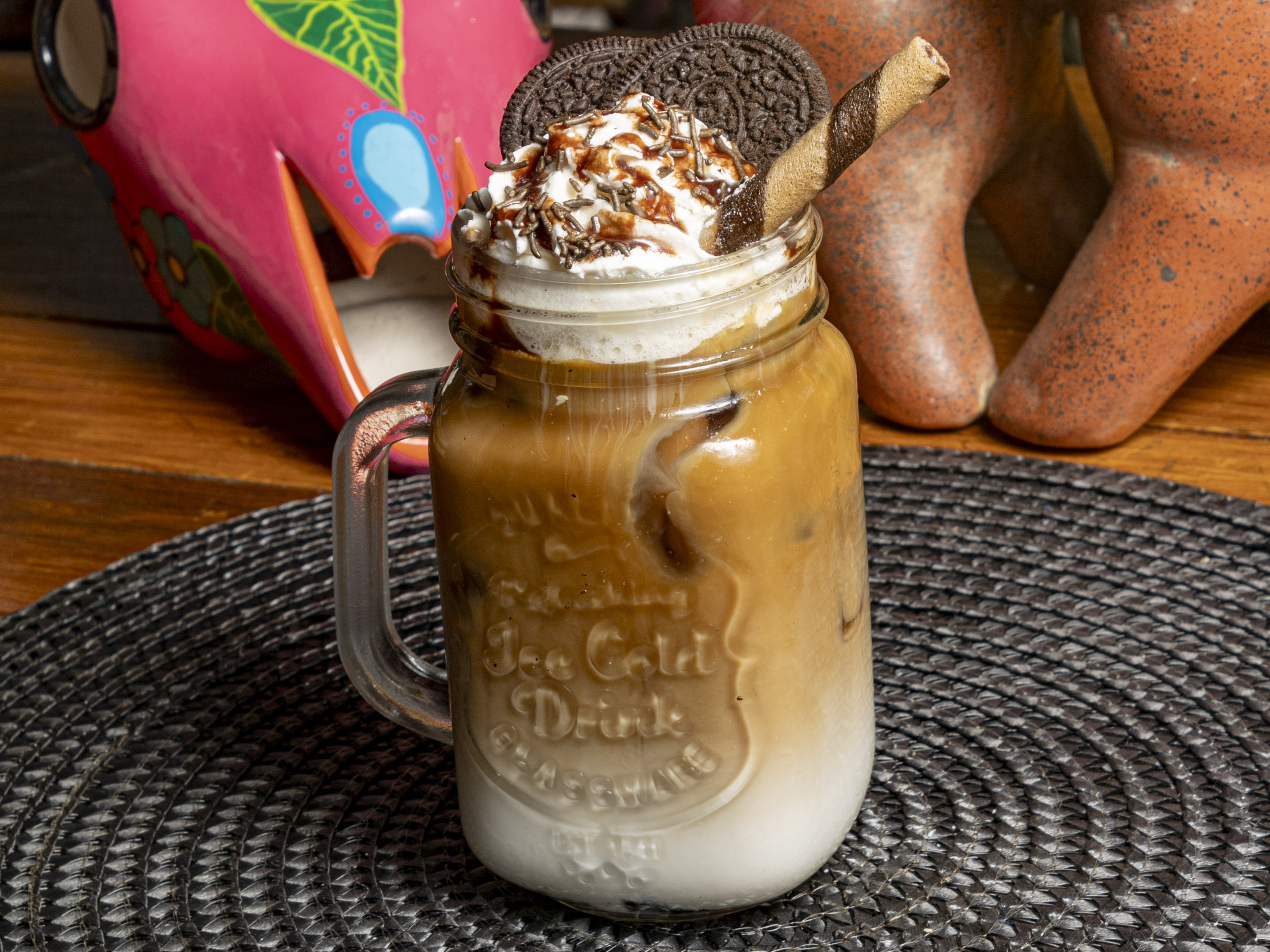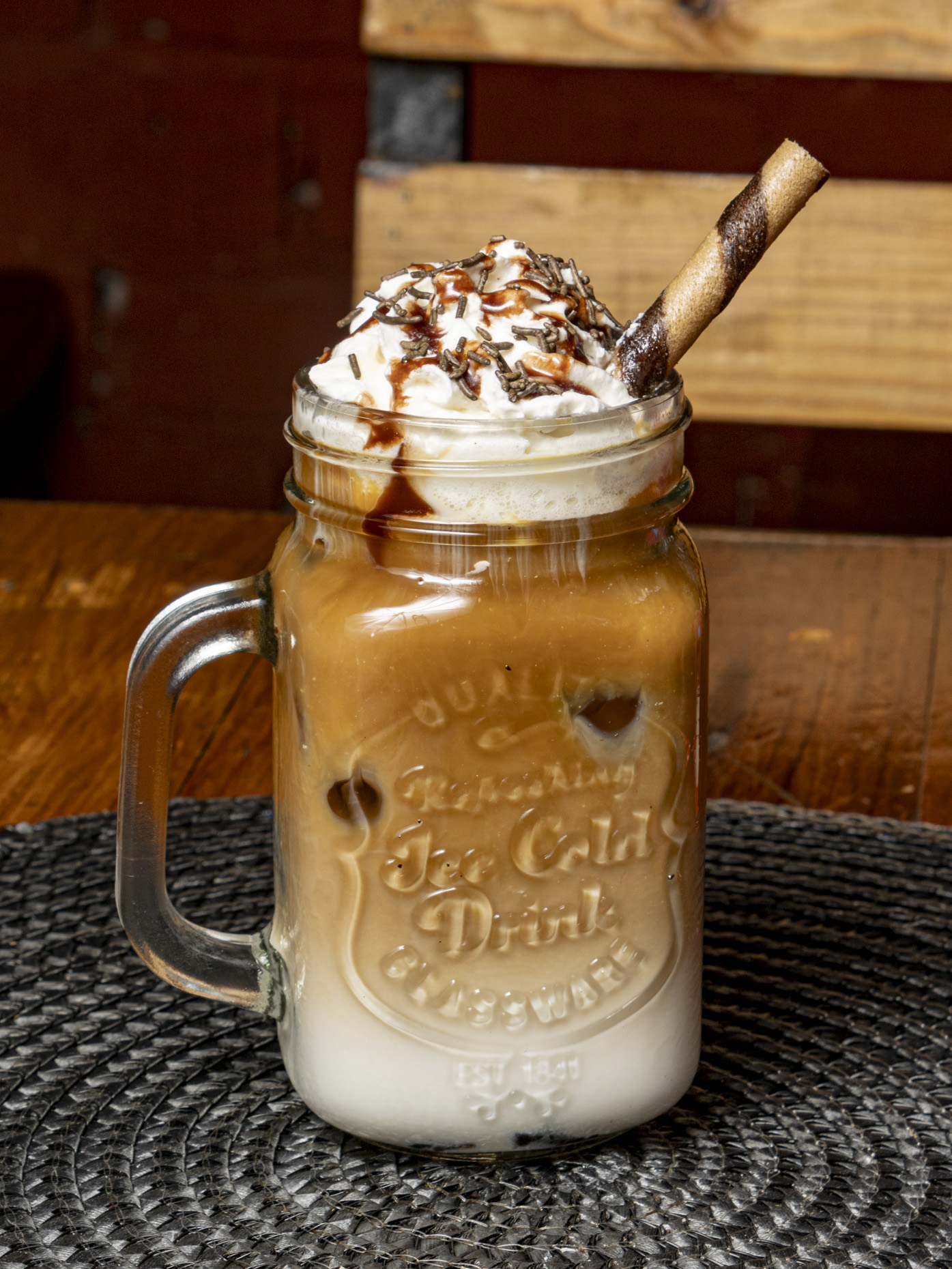 Espresso, leche, hielo, chocolate, chispitas, choco stick, chantilly
