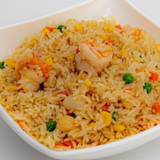 Arroz frito con camarón, pollo, res, zanahoria, elote, chicharo y cebollin