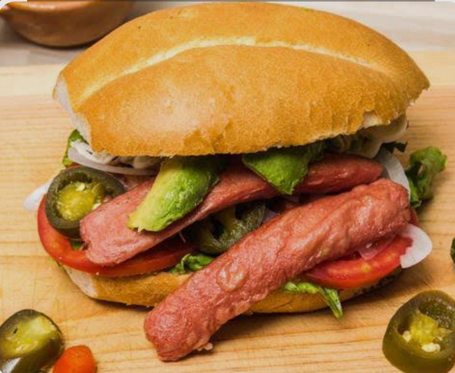 Torta especial acompañado de lomo adobado, salchicha tiras de res, jamón aderezo de la casa acompañado de salsa ketchup y mostaza y chiles jalapeños