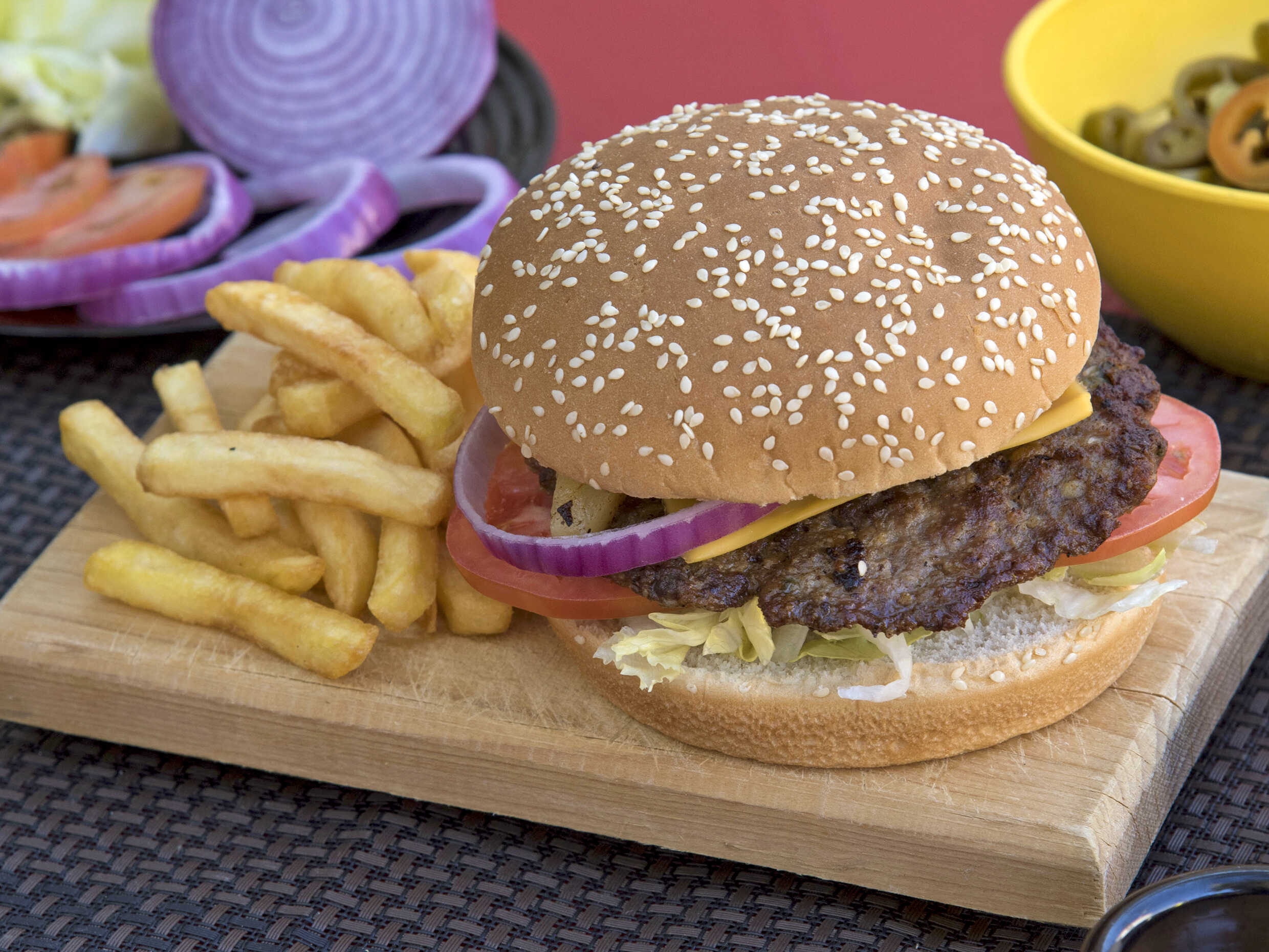 Hamburguesa clásica 100% carne de res ,pan artesanal americano lechuga jitomate y cebolla porción de papas personal