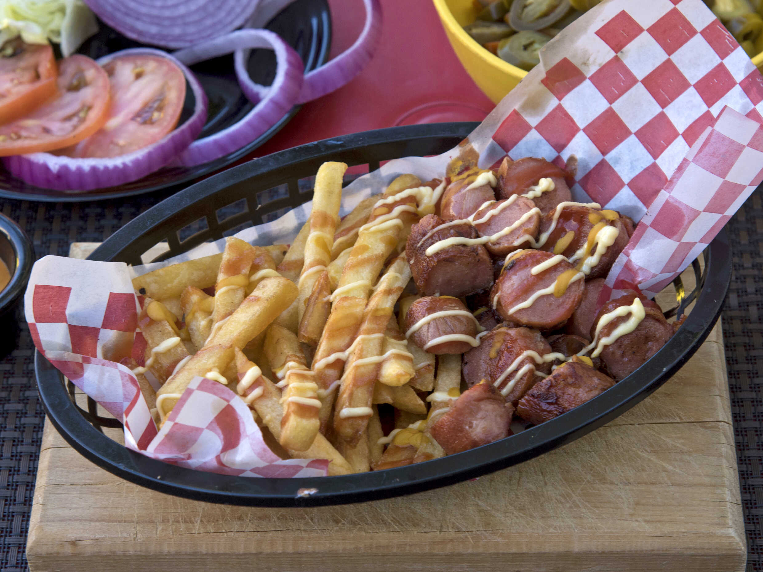 Papas fritas con un toque de sal, acompañadas de salchicha depavo picadas envueltas en tocino y cebolla.