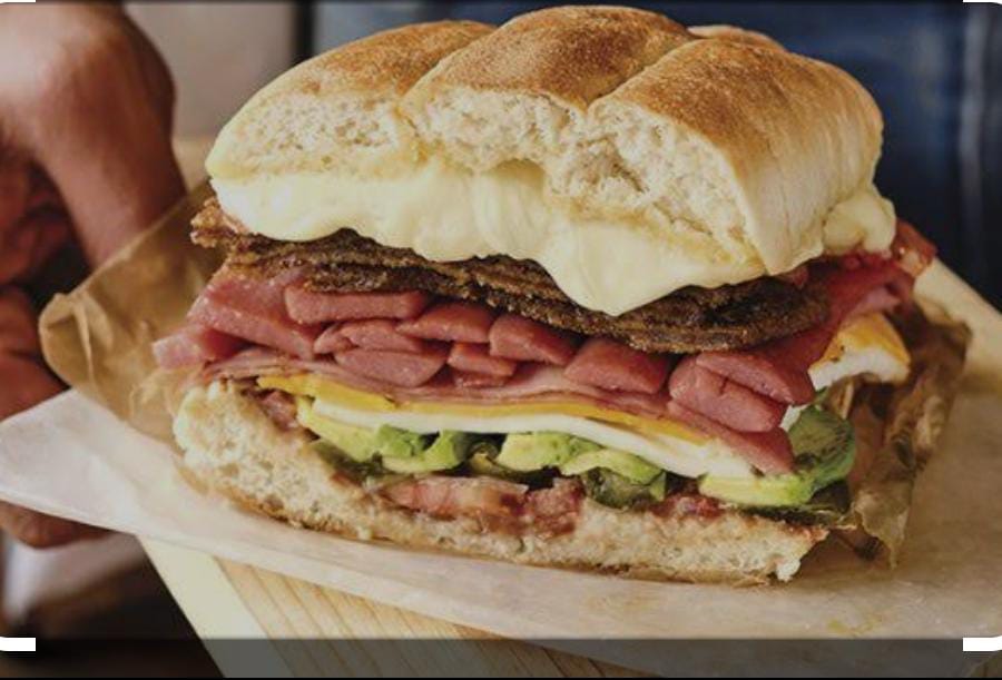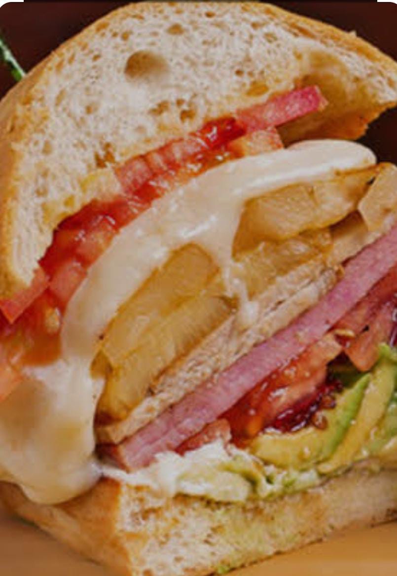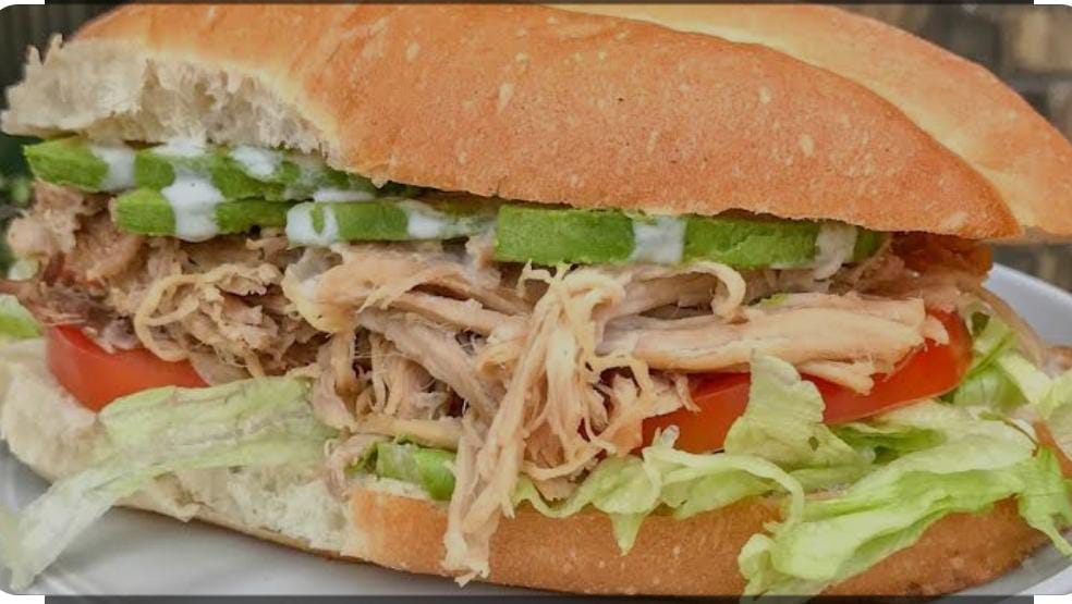 Torta Cubana, acompañado de lomo adobado jamón, salchicha, queso manchego,, aderezo de la casa acompañado de salsa ketchup y mostaza y chiles jalapeños