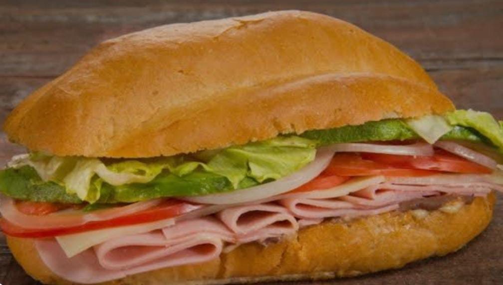 Torta de jamón de pavo, aderezo de la casa acompañado de salsa ketchup y mostaza y chiles jalapeños.