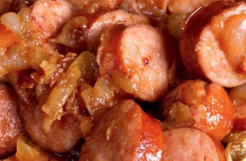 Salchichas de pavo (200 gr) envueltas en tocino picadas, Acompañadas de cebolla frita.