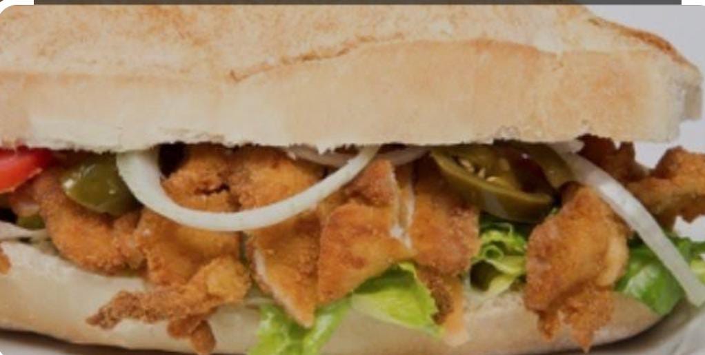 Milanesa de Pollo empanizada, lechuga, jitomate, cebolla,aderezo de la casa acompañado de salsa ketchup y mostaza y chiles jalapeños.