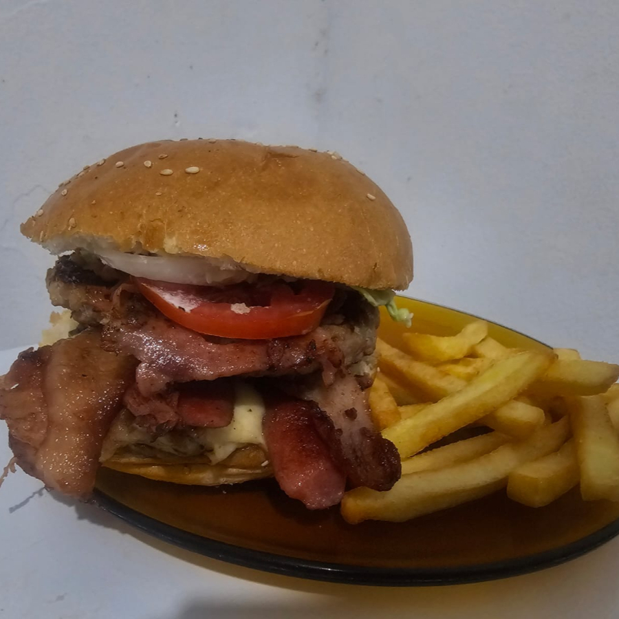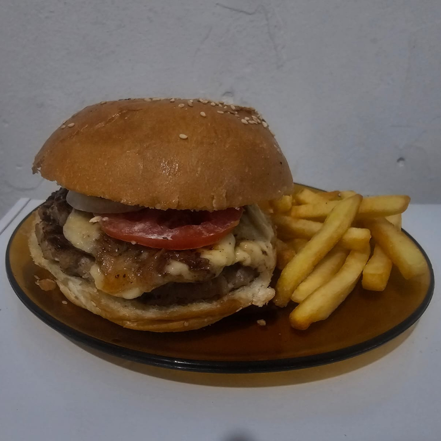 deliciosa hamburguesa con doble carne de res o pollo, queso amarillo, queso asadero, jitomate, cebolla, lechuga, papas a la francesa