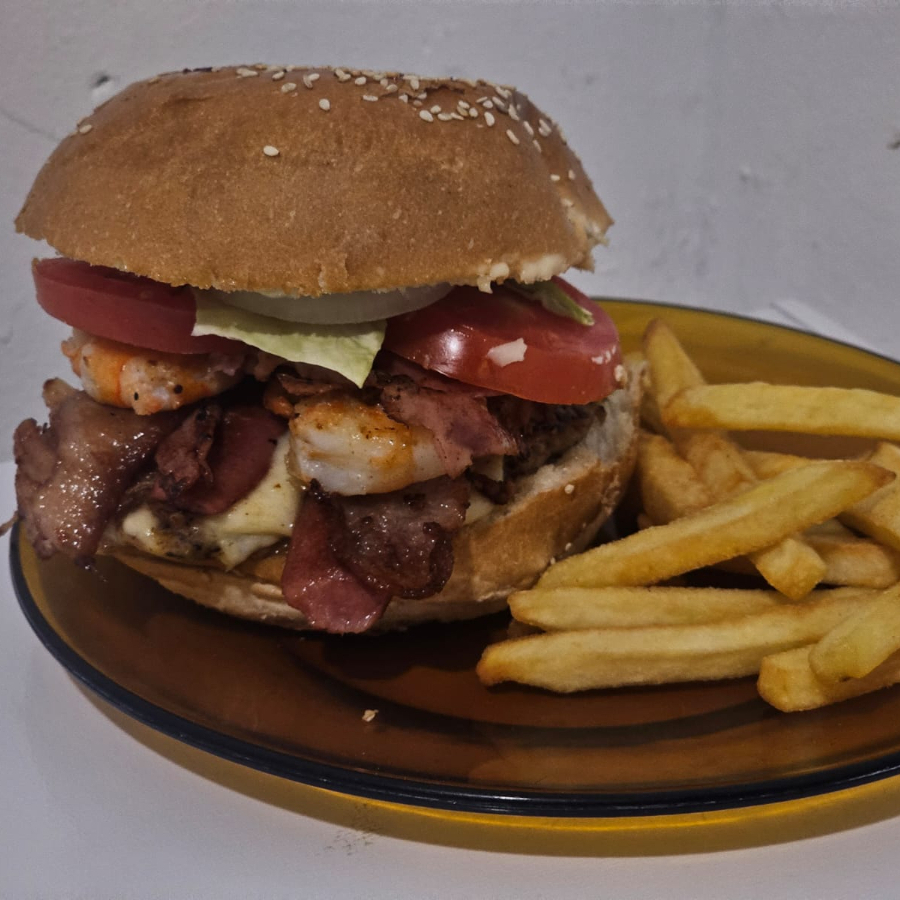 deliciosa hamburguesa concarne de res, camarones, queso asadero, queso amarillo, jamon , salchicha, tocino, jitomate, cebolla, lechuga, papas a la francesa