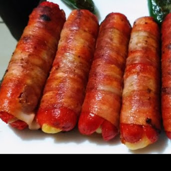 Delicioso hot dog hecho de salchicha para asar, rellleno de queso asadero, salchicha normal envuelto en tocino.