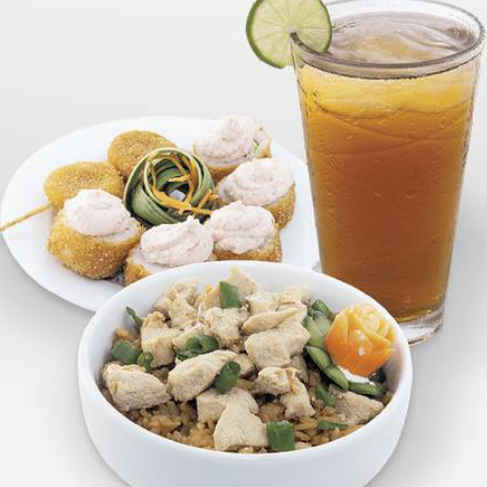 1 Orden de arroz, 1 orden de brochetas y 1 bebida.